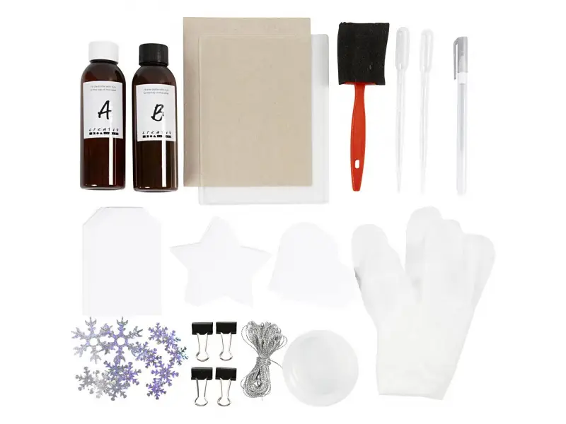 Zložky cyanotypie A + B, papierové štítky, strieborná fixka, flitre, šnúrka, plastová fólia s podložkou, klipy, kovová dóza, penový štetec, pipeta a rukavice