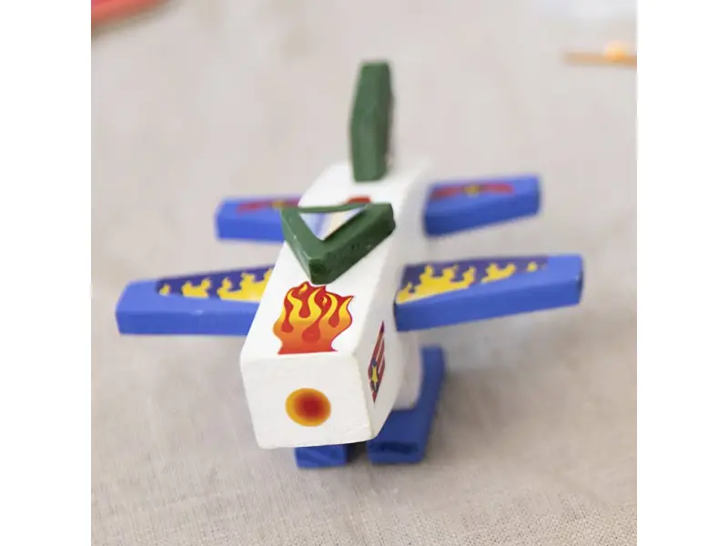 Originálna kreatívna súprava na výrobu dreveného lietadla deťom umožní postaviť si vlastnú hračku od úplného začiatku – najprv jednotlivé diely nafarbia, nechajú zaschnúť, potom ich zlepia a nakoniec dozdobia samolepkami. Výsledkom je jedinečné lietadlo pripravené na hranie aj vystavenie v detskej izbe.