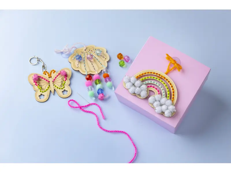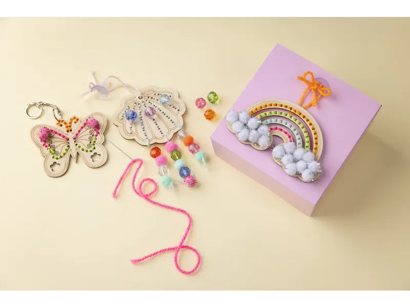 Užite si radosť z tvorenia s touto originálnou sadou na výrobu vyšívaných drevených ozdôb. Sada vám umožní tvoriť spoločne s dieťaťom – vyšívať, zdobiť korálkami a brmbolcami a vytvoriť roztomilé dekorácie aj doplnok na tašku. Deti si vyrobia jednu kľúčenku a dve závesné ozdoby do okna, ktoré si môžu vytvoriť v obľúbených farbách. Ideálna aktivita na daždivé popoludnie, pokojný čas doma alebo rodinné tvorenie.