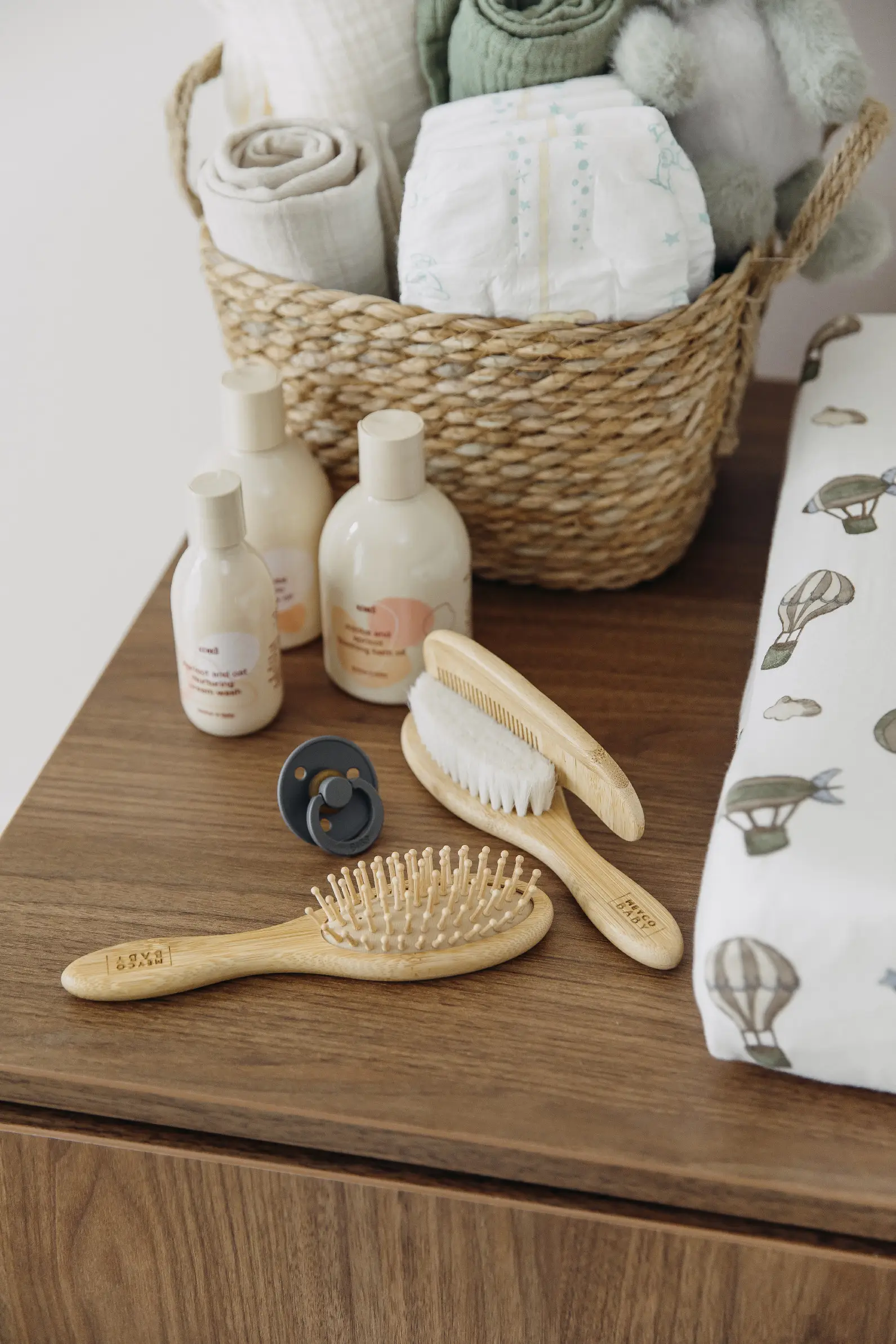 Sada obsahuje dřevěný hřeben, kartáč z měkké kozí srsti pro citlivou pokožku hlavy vašeho dítěte a bambusový kartáč pro hustší vlasy.