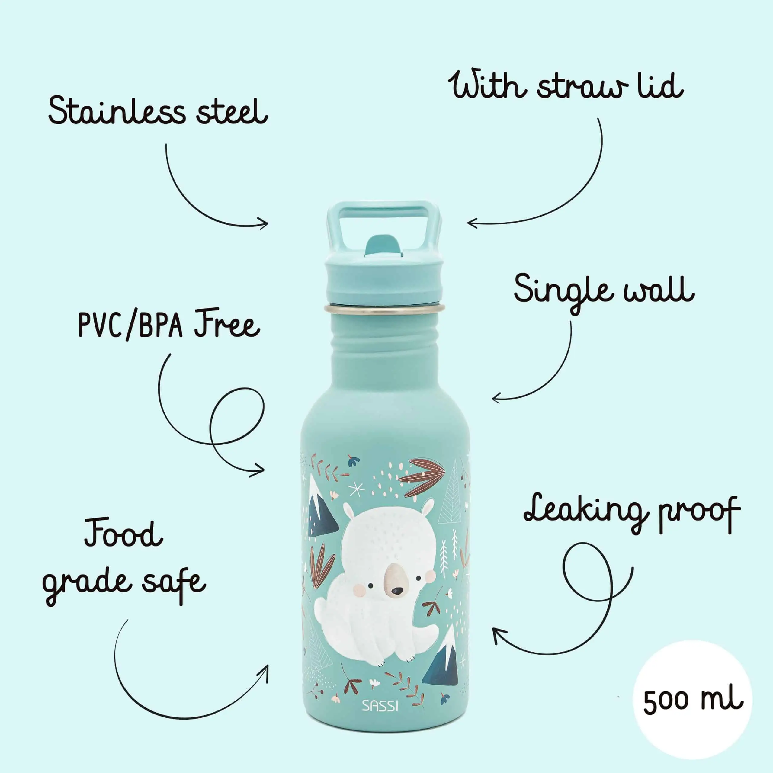 Navrženo tak, aby vydrželo - kojenecká lahev SASSI 500 ml z nerezové oceli je dokonalou kombinací odolnosti, bezpečnosti a stylu, vytvořenou tak, aby doprovázela vaše nejmenší na všech jejich dobrodružstvích.