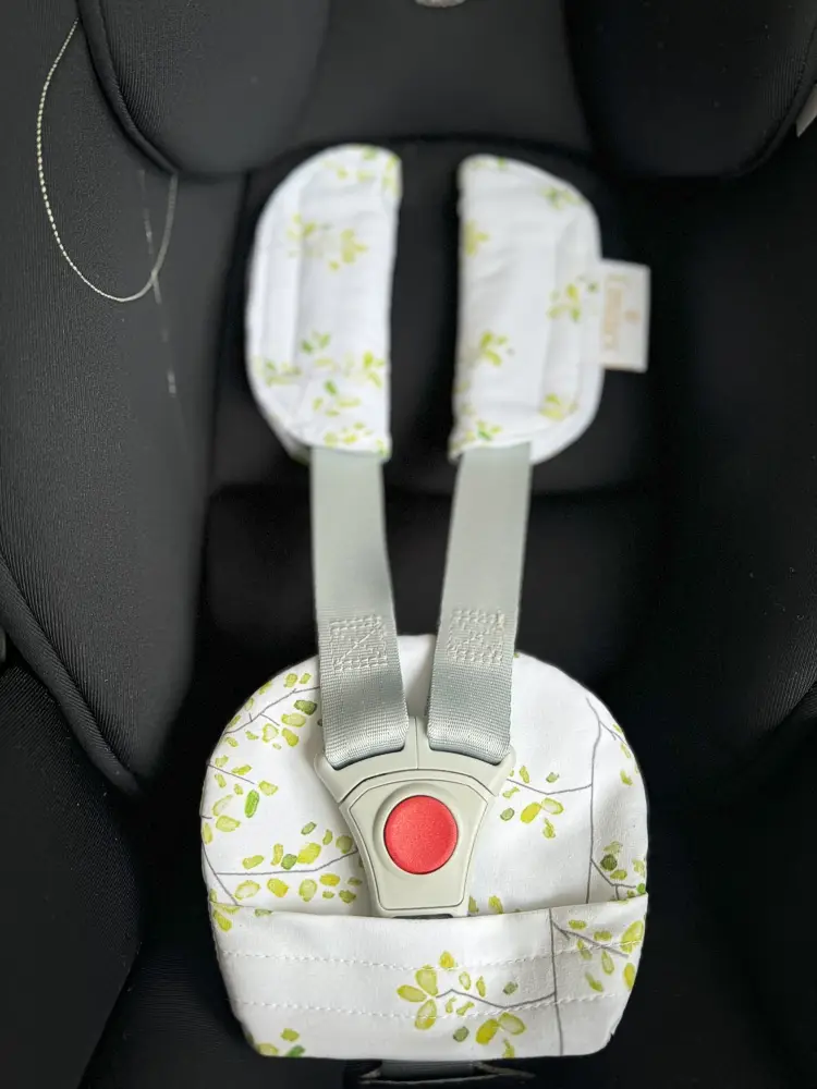 Použití vhodné jak v kočárku, tak v autosedačce. Ramenní polstrování mají suché zipy pro rychlé nasazení, větší polstrování se na sponu autosedačky navléká.