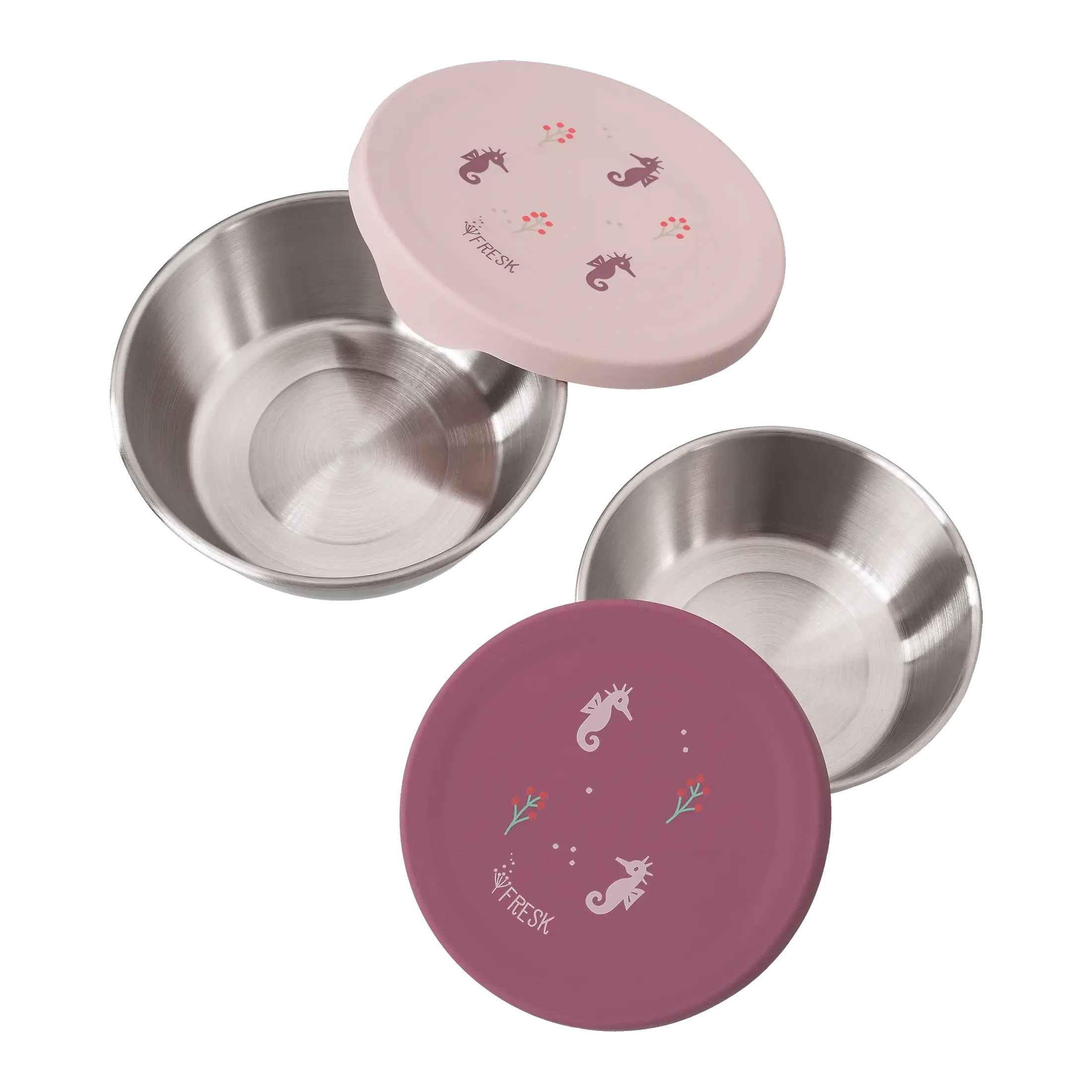 Dve dózy sú vyrobené z pevnej nehrdzavejúcej ocele a majú praktické silikónové viečka. Oceľové dno zabezpečuje, že nenaťahujú farbu ani vôňu z potravín, a flexibilné silikónové viečko ľahko otvoria aj malé detské rúčky.