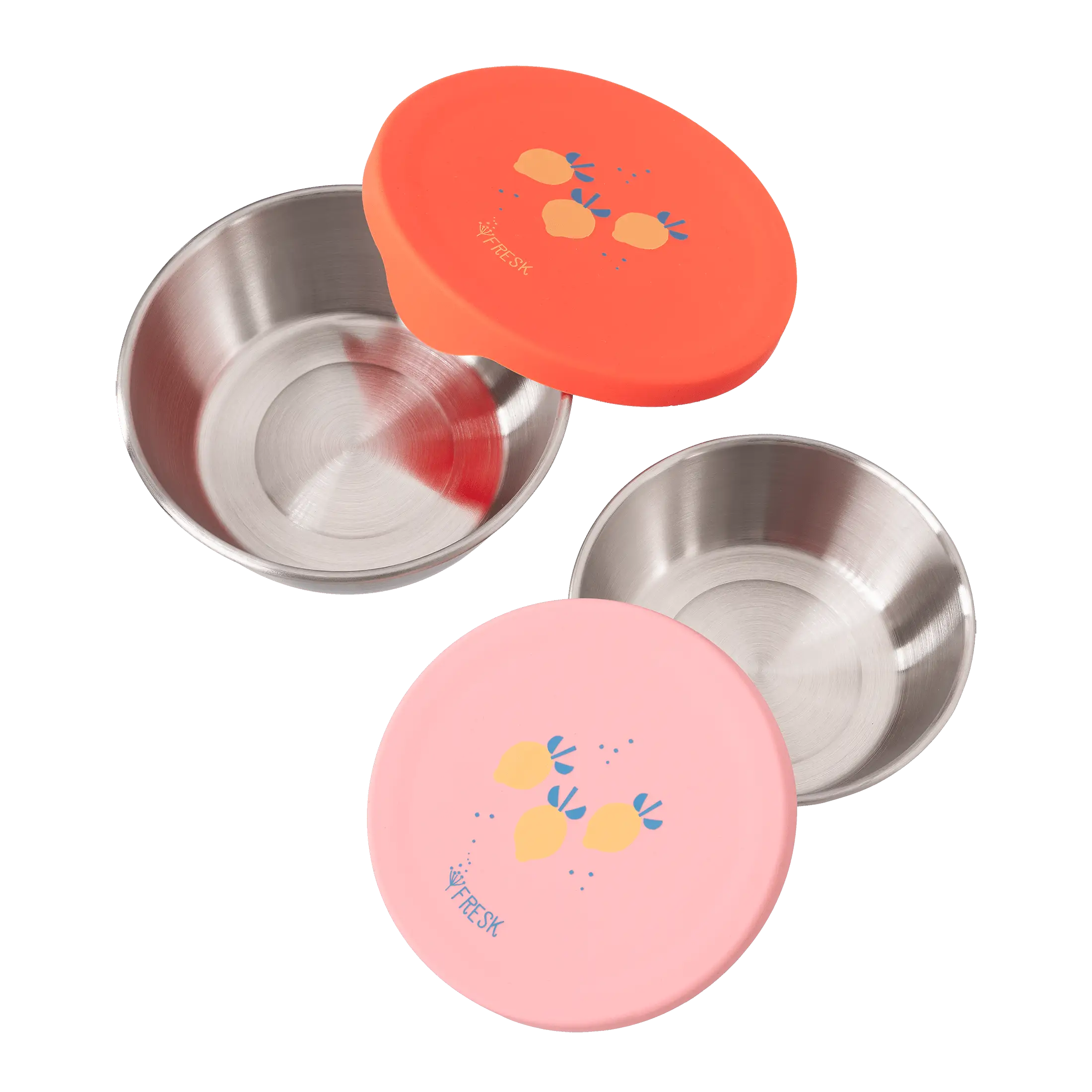 Dve dózy sú vyrobené z pevnej nehrdzavejúcej ocele a majú praktické silikónové viečka. Oceľové dno zabezpečuje, že nenaťahujú farbu ani vôňu z potravín, a flexibilné silikónové viečko ľahko otvoria aj malé detské rúčky.
