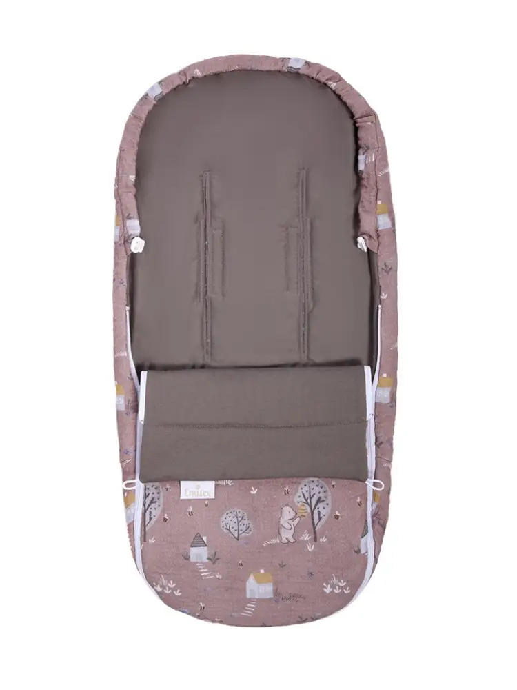 Predný diel je úplne odnímateľný pomocou dvoch zipsov. Dieťa tak je možné pohodlne umiestniť a vrchný diel potom pripnúť zipsy. V oblasti hlavičky je možné vrchnú časť fusaku stiahnuť, voľné šnúrky potom aj s brzdičkou schovajte do tunela od šnúrky, aby dieťaťu neprekážali. Zadná časť fusaku je prispôsobená päťbodovému upínaniu. V dolnej časti opatrne prestrihnite obšité otvory, podľa toho, ktorý Vám bude vyhovovať.
