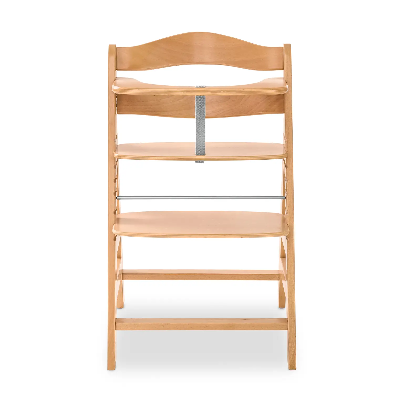 DREVENÁ VYSOKÁ STOLIČKA – BEZPEČNÁ A STABILNÁ // Všetko, čo vaše dieťa potrebuje, je súčasťou balenia. Roznožkový pás, 5-bodový bezpečnostný pás a ochranný oblúk. S výškou 70 cm vrátane bezpečnostnej tyče sa vysoká stolička Alpha+ ľahko zmestí pod takmer každý stôl. A vďaka 8 nastaviteľným polohám sedadla a opierky nôh táto vysoká stolička rastie spolu s vaším dieťaťom.
