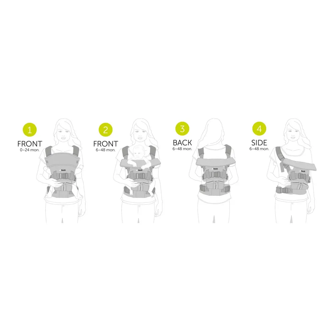 4 možnosti nošení // Nosič 4 Way je perfektní volbou pro aktivní rodiče, byl vyvinut s ohledem na ergonomické normy. Umožňuje nosit vaše děťátko na břiše, na zádech a na boku ve čtyřech různých polohách. S prodyšnou podšívkou a různými možnostmi nastavení splňuje Nosič 4 Way všechny předpoklady ke komfortnímu a ergonomicky správnému nošení dítěte.