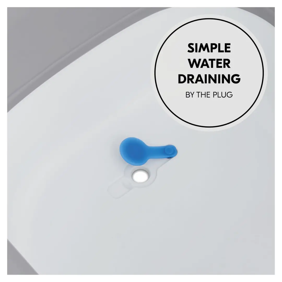 Skladacia vanička pojme až 90 litrov vody a má maximálnu nosnosť 40 kg, takže vaše dieťa bude mať dostatok priestoru a vy môžete ušetriť trochu vody v porovnaní s používaním bežnej vaničky. Mäkké a zaoblené časti pomáhajú udržať vaše dieťa v bezpečí, zatiaľ čo sklopné stojany ponúkajú stabilnú polohu na rovnom povrchu. A aby sa vaše dieťa cítilo pohodlne, keď je teplota okolo 36 stupňov, zátka indikuje príliš horúcu vodu zmenou farby na bielu, aby ste mali približnú informáciu.