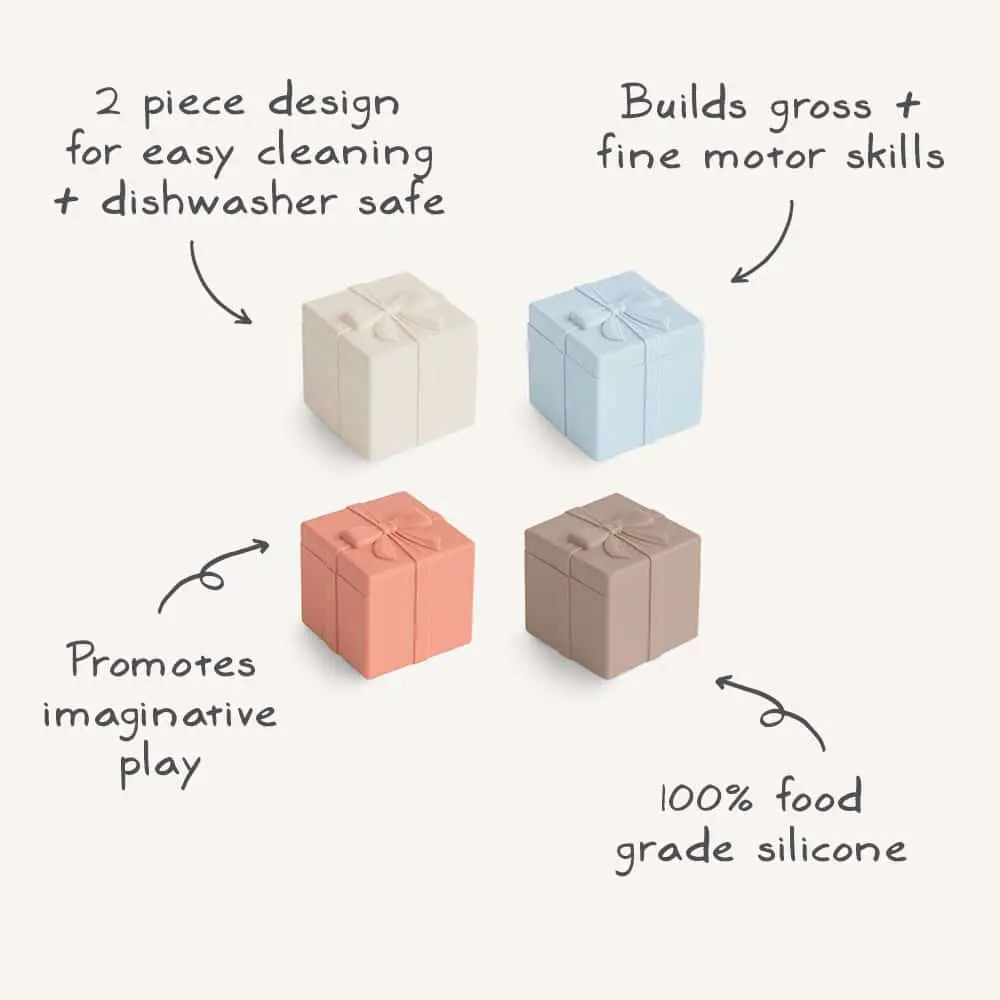 Každá z farebných silikónových krabičiek má odnímateľné viečko, ktoré možno medzi sebou voľne kombinovať, čím si deti vytvárajú vlastné originálne "darčeky". Vďaka kompaktným rozmerom sa perfektne zmestia do malých detských rúk a zároveň ponúkajú priestor aj na skladovanie drobných pokladov.