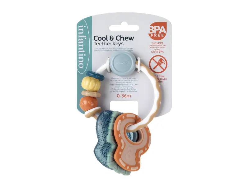 Hrkálka Infantino v podobe krúžku s posuvnými korálkami a kľúčami, ktoré slúžia aj ako hryzátka na úľavu pri prerezávaní prvých zúbkov. Hryzátka majú rôzne povrchy (mäkšie aj pevnejšie) a je možné ich ochladiť v chladničke pre väčšiu úľavu pri raste zúbkov. Hračka pri pohybe jemne hrká.