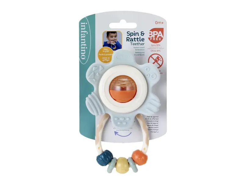 Hrkálka Infantino v tvare kvety má tvar pre ľahké uchopenie. Pozornosť dieťaťa upútajú pohyblivé rôznofarebné krúžky na rukoväti aj hrkajúce korálky v priehľadnej guličke uprostred hračky. Okvetné plátky kvetu slúžia ako hryzátka, ktoré dieťaťu pomôžu pri prerezávaní prvých zúbkov.