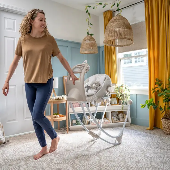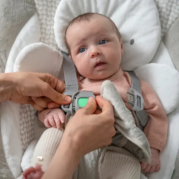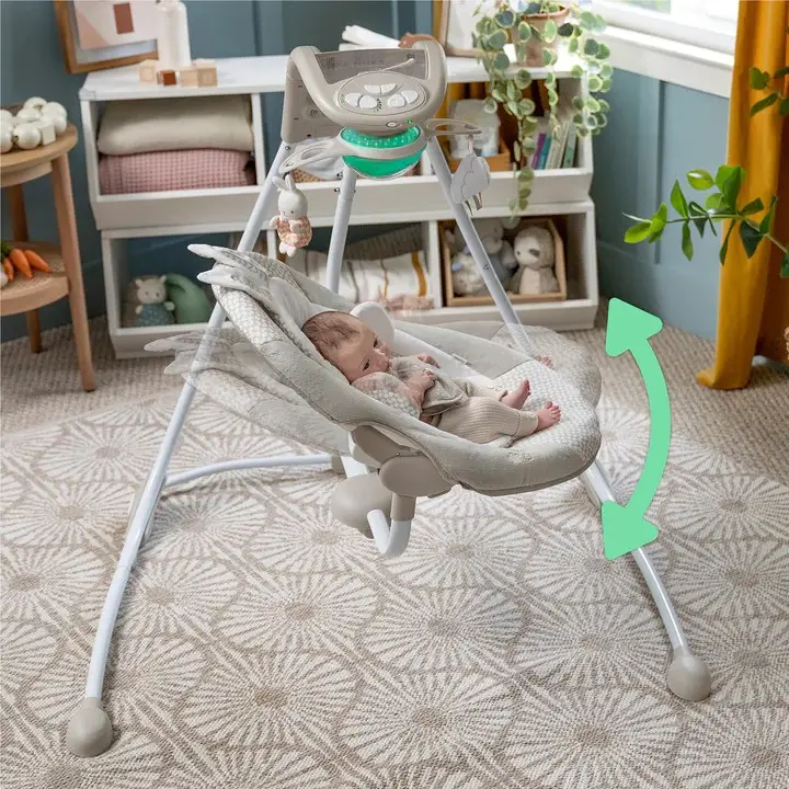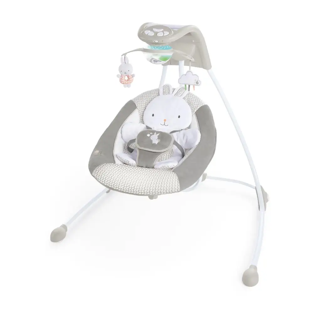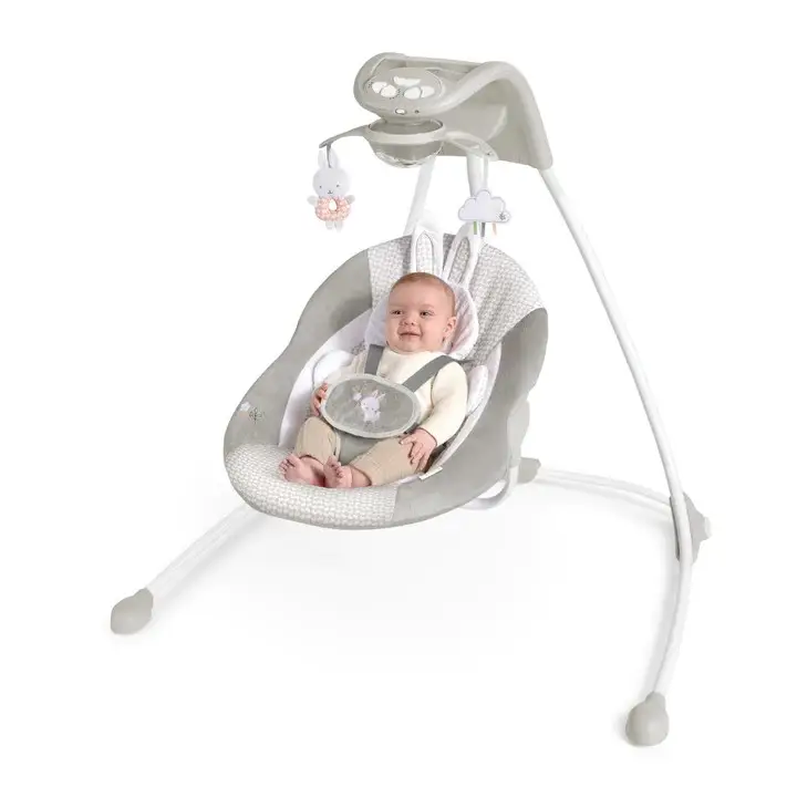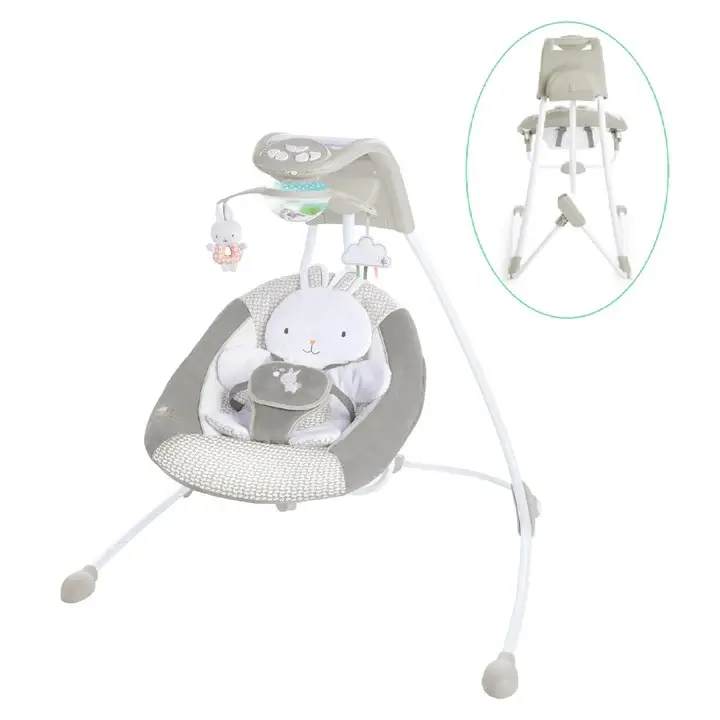 Vďaka 2 polohám naklonenia, jemným detailom a mäkkým tkaninám sa bábätko môže hojdať v príjemnom pohodlí v 3 rôznych smeroch. Novorodenecká vložka v tvare zajačika poskytuje novorodencom dodatočnú oporu a keď dieťatko vyrastie môže poslúžiť ako samostatná hračka. Skladací rám je ľahký a jednoducho sa prenáša alebo presúva z izby do izby.