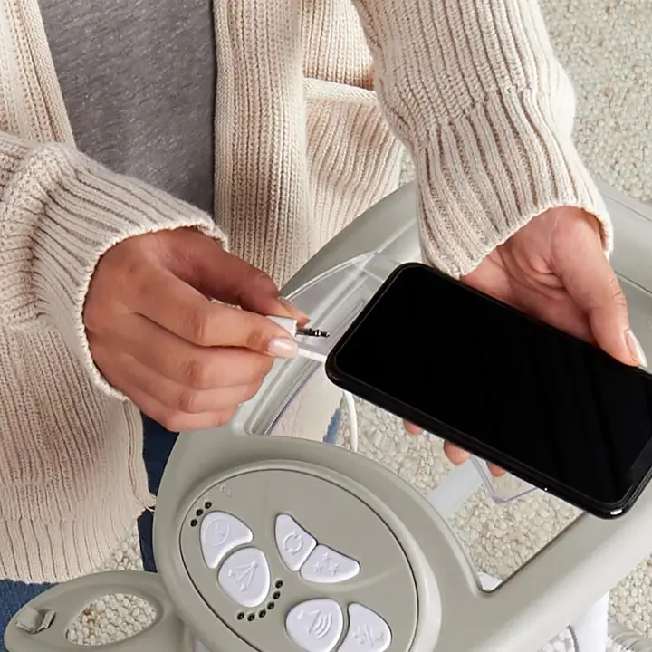 Pomocou funkcie ConnectMe môžete pripojiť inteligentné/smart zariadenie a prehrávať personalizovanú hudbu, videá, fotografie alebo ďalšie funkcie! Alebo upokojte bábätko pomocou 16 melódií, 3 zvukov prírody a bieleho šumu. Dodávaný USB kábel napája pohyb hojdačky, hudbu a svetlá.