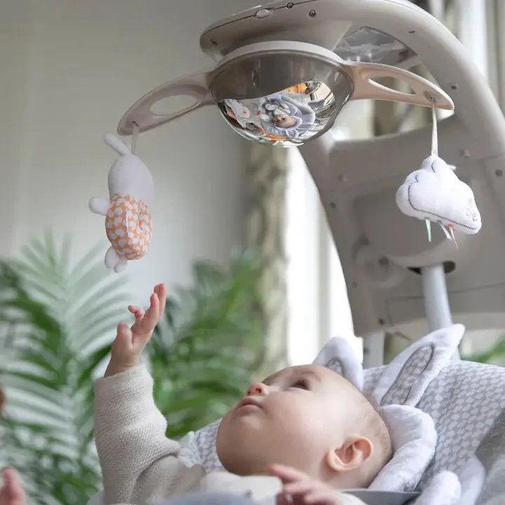 Luxusná veľká hojdačka s množstvom funkcií pre upokojenie a zabavenie dieťatka. Táto automatická detská hojdačka zvládne takmer toľko úloh ako vy. Hojdačka obsahuje 2 plyšové hračky, oslnivé svetlá a navyše zrkadlo, takže bábätká sa môžu pozerať na svoj odraz. Bábätká sa radi natiahnu za plyšovým zajačikom a obláčikom, ktoré sú súčasťou balenia.