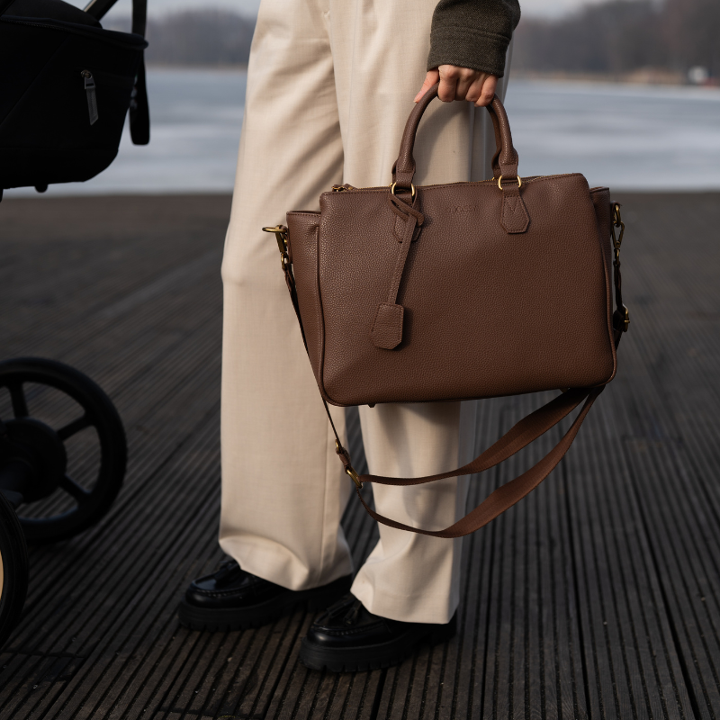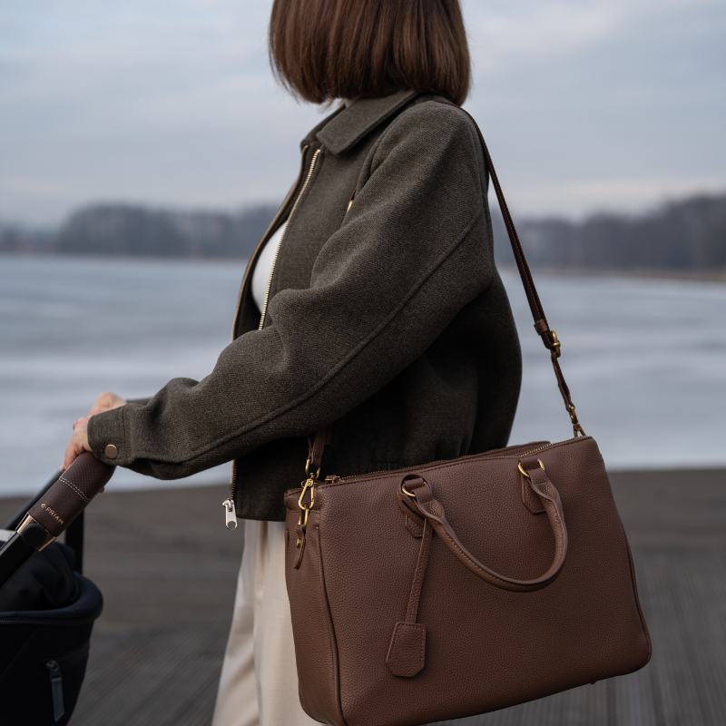 Táto prebaľovacia taška skvele vyzerá na akomkoľvek kočíku a vašu eleganciu podčiarkne aj keď si ju vezmete do ruky, či na rameno.