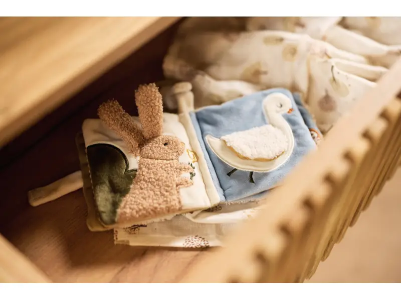 - Vnútri knižky nájdete stránky so zvieratkami z rôznych textilných materiálov, ktoré svojimi rôznorodými textúrami lákajú na skúmanie