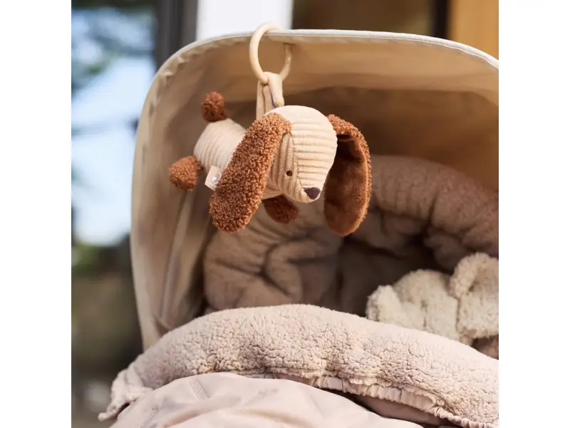 Rozkošný závesný psík Diego z mäkkej rebrovanej látky s buklé detailmi je ideálnym spoločníkom pre vaše bábätko na prechádzkach a výletoch. Vďaka plastovému krúžku ho ľahko pripevníte na kočík alebo autosedačku.