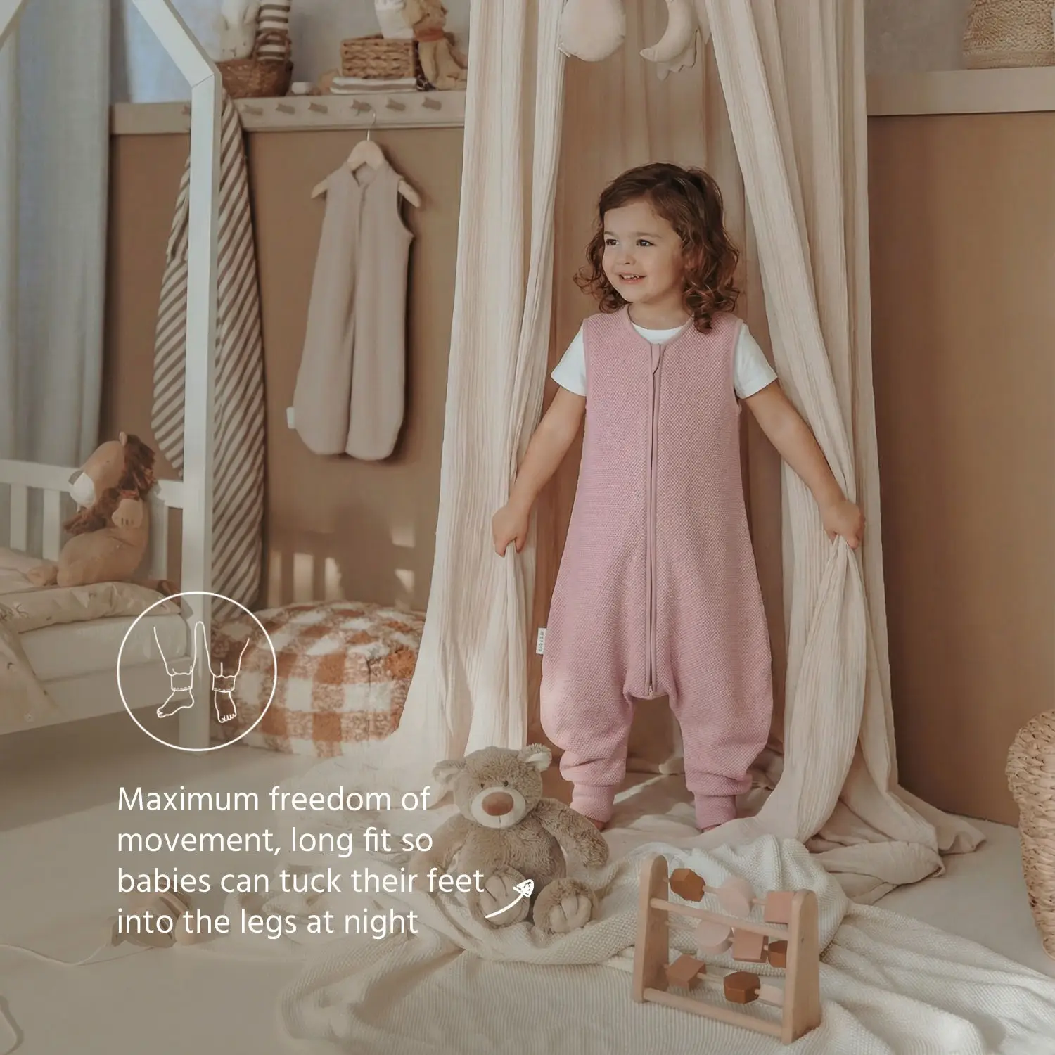 Spací vak s nožičkami je bez podšívky vyrobený z mäkkého dvojvrstvového materiálu: vnútorná strana je zo 100 % bavlneného džerseja, vonkajšia strana je z 58 % bavlny, 39 % polyesteru a 3 % elastanu.