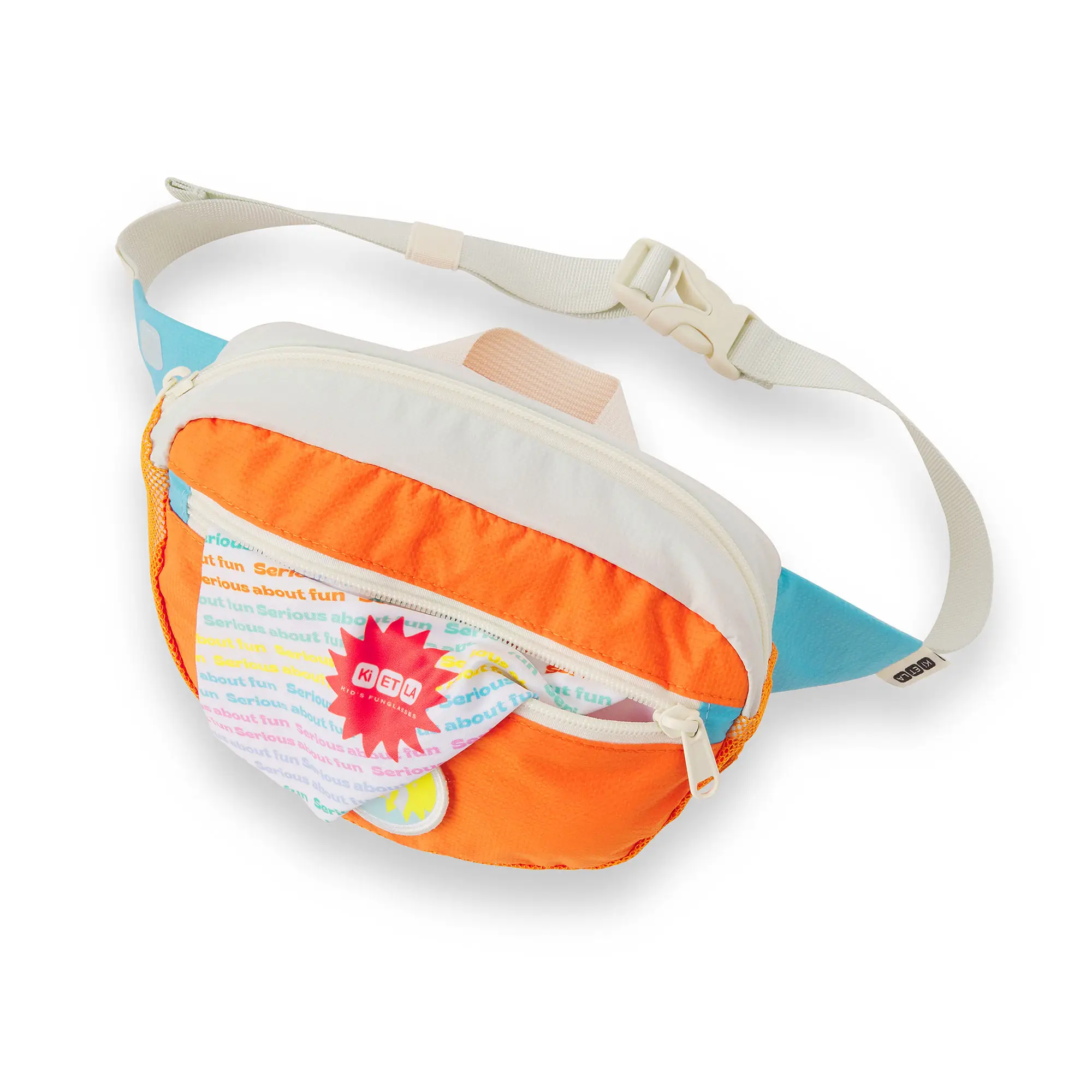Hlavné vrecko ľadvinky je sieťované a pomáha odvádzať piesok a vlhkosť. Vo vnútri vrecka je štítok, na ktorý môžete napísať meno vášho dieťaťa. Predné vrecko je podšité mikrovláknom a má všitú handričku na čistenie slnečných okuliarov KiETLA. Ľadvinka má na boku aj malú gumičku, ktorá je ideálna na uterák alebo pripevnenie kľúčenky.