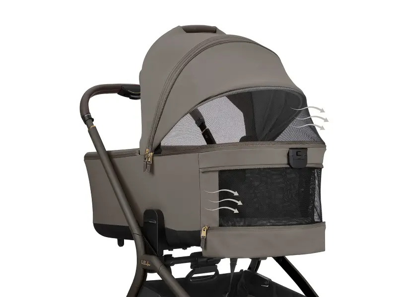 Pre pohodlie dieťaťa je súčasťou obojstranný mäkký matrac so zimnou stranou z kvalitného zamatového materiálu a letnou stranou z priedušnej sieťoviny pre lepšiu ventiláciu. Strieška má zipsové predĺženie, slnečnú clonu a dopĺňa ju extra slnečná clona pre maximálny tieň. Ventiláciu zaisťujú sieťované vetracie otvory na strieške aj v oblasti hlavy. Praktická je aj vrecko na telefón na zips.Vodeodolný textilný materiál s UPF 50+ chráni dieťa pred poveternostnými vplyvmi a slnečným žiarením.