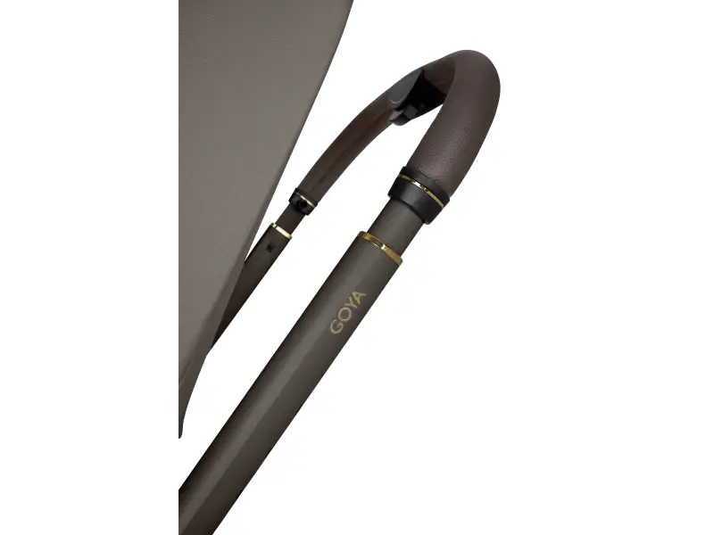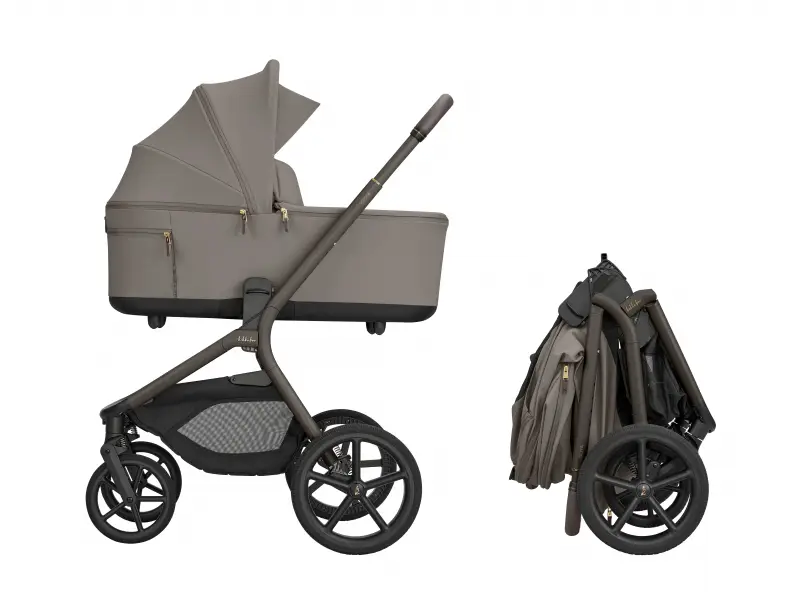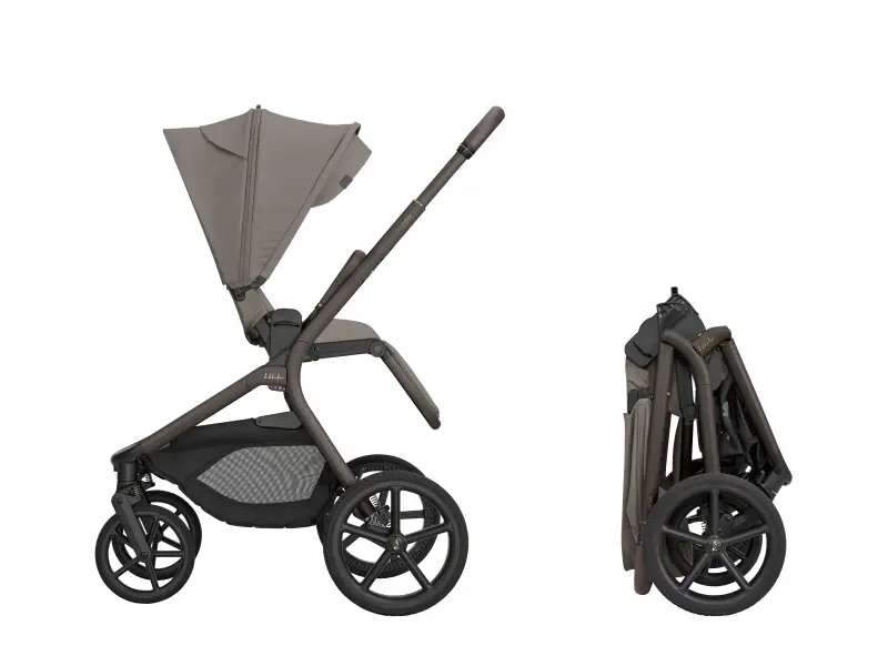 Po zložení kočík samostatne stojí. Pre ľahké prenášanie je pripravený popruh cez rameno a madlo.