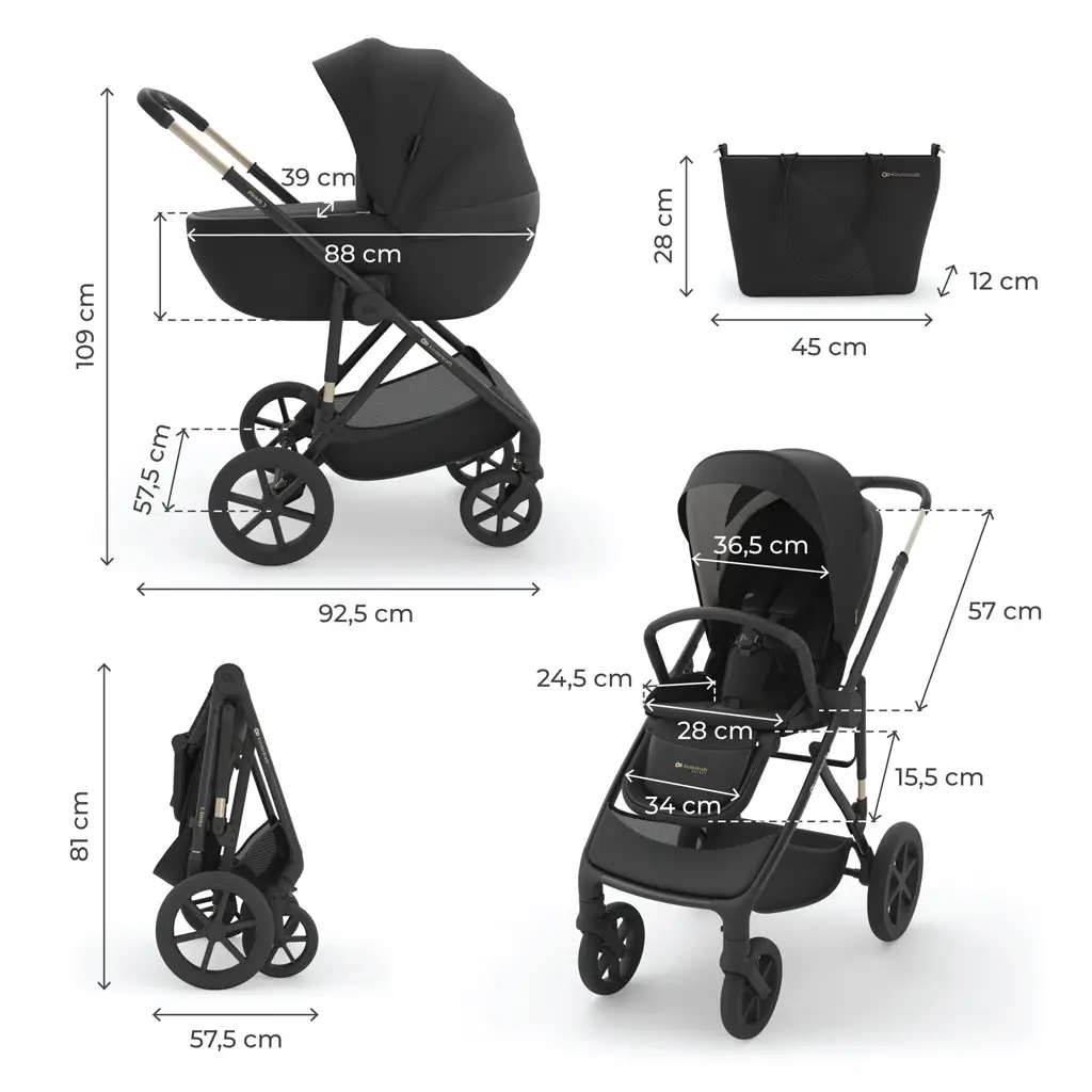 - Vybavenie v sade: hlboká korba, športová sedačka, rám s kolesami, taška pre rodičov, nákupný kôš