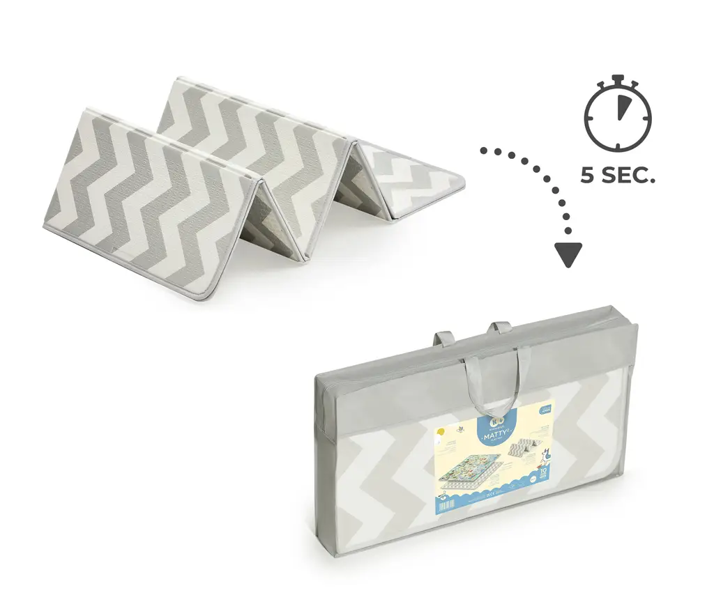 Zloženie podložky MATTY 2 vám zaberie len 5 sekúnd. Nemusíte ju zvinúť do nepohodlnej, veľkej rolky - zloženie podložky a jej príprava na cestu vám zaberie len chvíľu, keď ju vložíte do priloženej tašky.