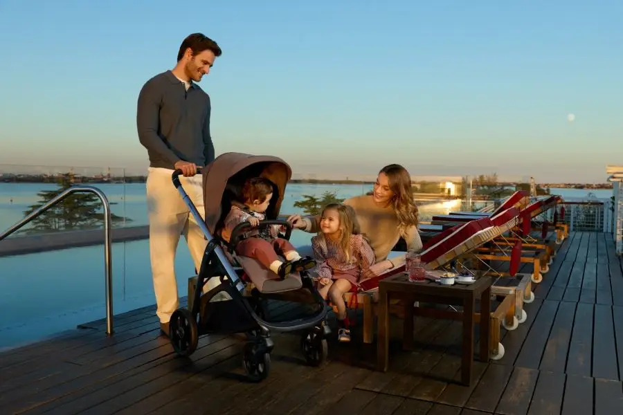 Kočík Aptica 4v1 Recline sa skladá z: hlbokej vaničky, matraca, Welcome PadTM, stojana Stand UpTM, autosedačky Darwin Recline EVO R129, športovej sedačky All Season s búdkou a vložkou, košíka, držiaka pohárika a nového podvozku Aptica.