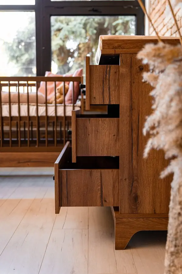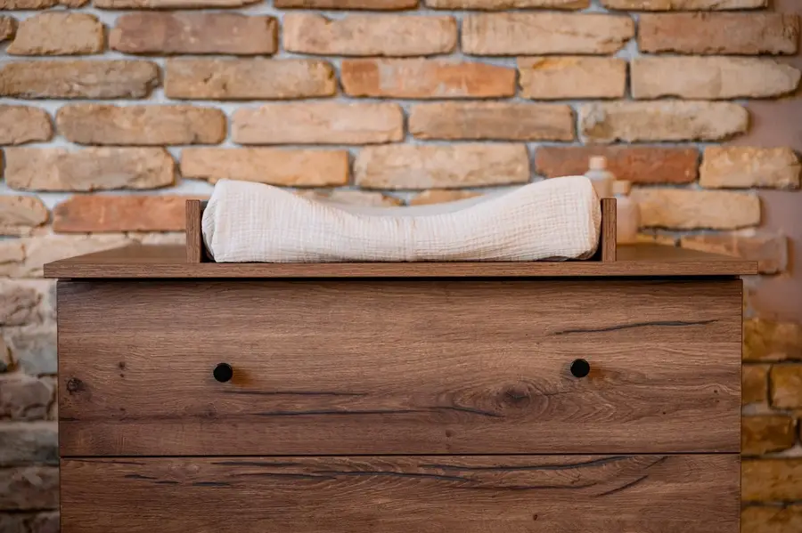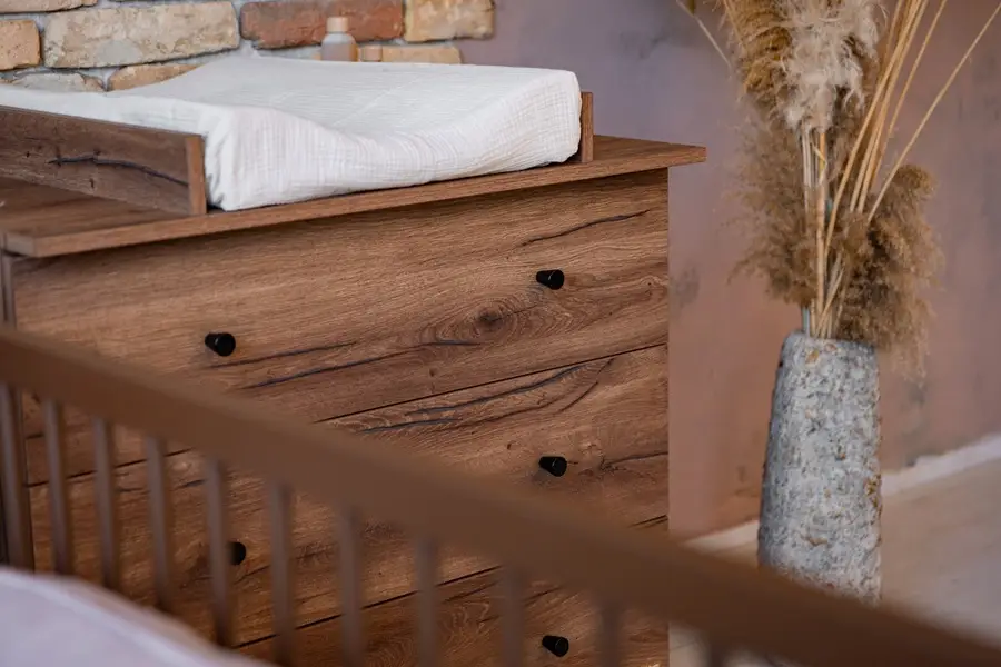 Izba pre novorodencov sa prakticky nezaobíde bez komody a prebaľovacieho pultu. Zásuvková komoda Nest Walnut v odtieni tmavého orecha s čiernymi úchytkami, ktoré dodáva nábytku osobitý vzhľad, tvorí taký kúsok nábytku, ktorý po doplnení o prebaľovací nástavec, pokrýva oba tieto požiadavky. Je navrhnutá tak, aby sa zmestila do relatívne malého priestoru, a napriek tomu ponúkla čo najväčšiu pomoc novým rodičom.