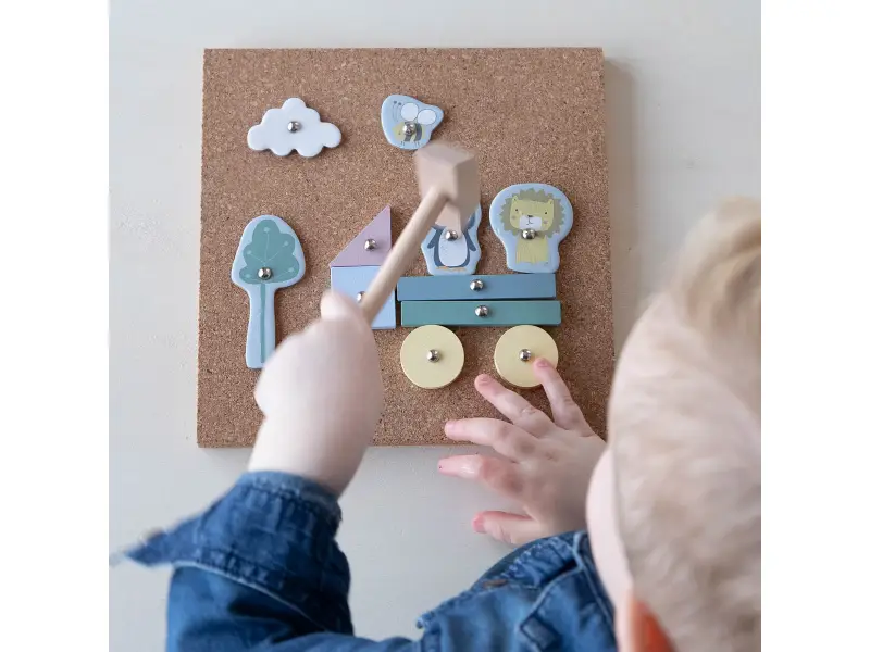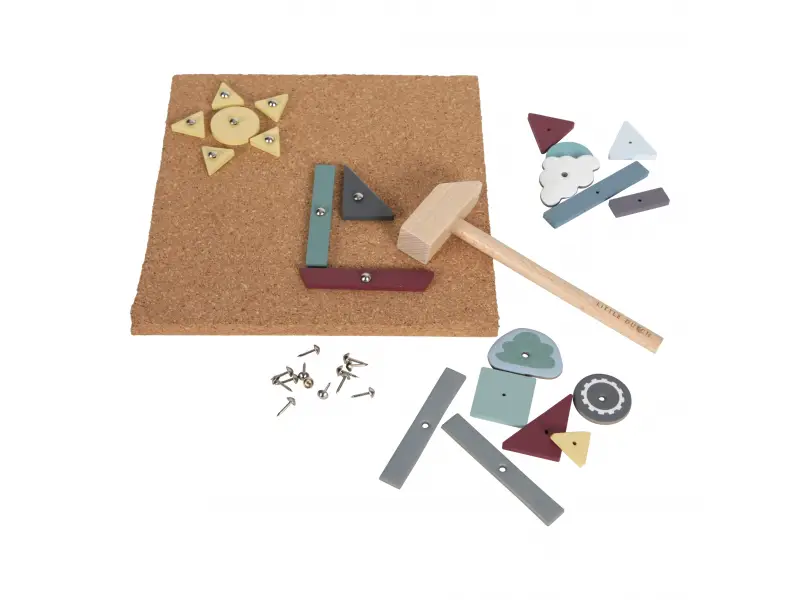 Sada obsahuje korkovú dosku, drevené kladivko, rôzne drevené a kartónové tvary, 4 kartičky so vzorovými obrázkami a 70 klincov.