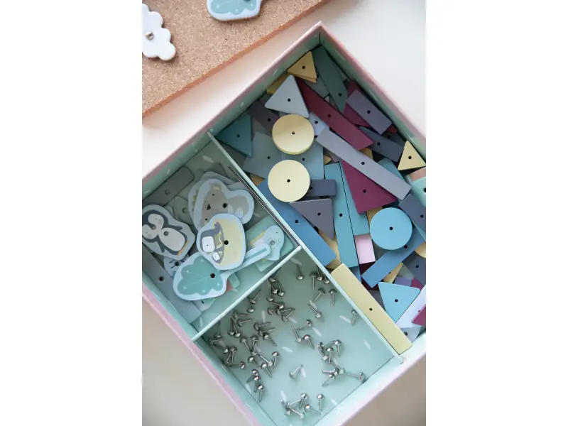 Kreatívna sada umožňuje deťom popustiť uzdu svojej fantázii a z rôznych geometrických tvarov vytvárať nekonečné množstvo obrazcov. Jednotlivé tvary dieťa pripevňuje ku korkovej doske s pomocou kladivka a klincov.