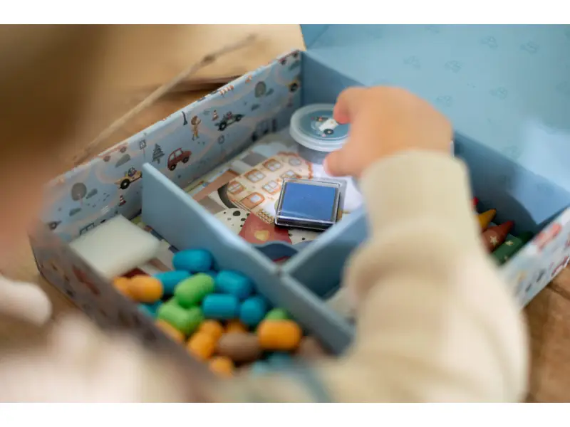 Súčasťou sady sú farebné papiere, omaľovánky, voskovky, farby, penová hmota, pečiatky a samolepky – všetko, čo malé ručičky potrebujú na nekonečnú zábavu. Ideálne pre spoločné tvorenie, objavovanie nových materiálov a rozvíjanie kreativity aj jemnej motoriky.