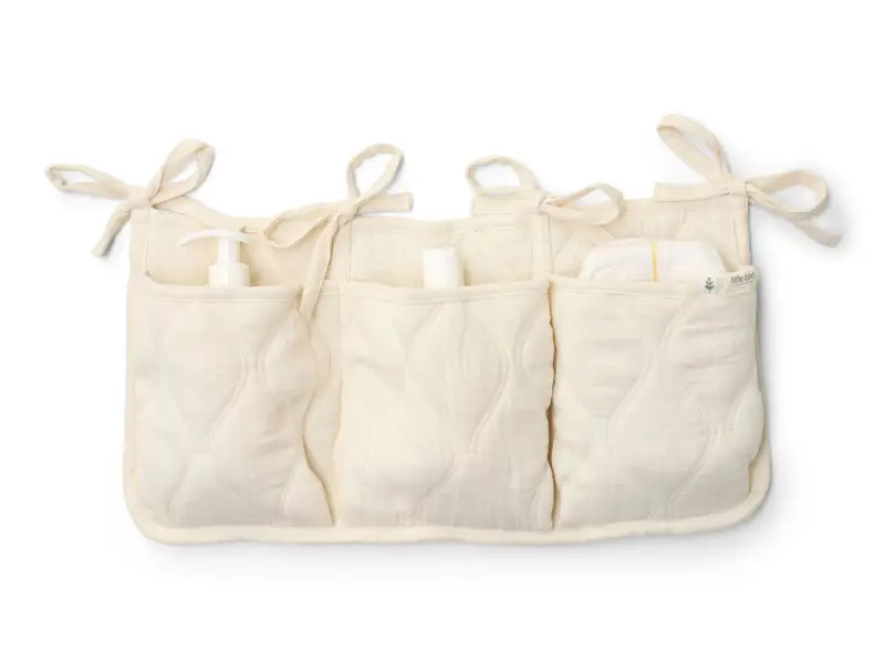 Praktický závěsný organizér v krásném provedení s ozdobným prošíváním vám umožní mít vše potřebné pro péči o vaše miminko vždy po ruce. Organizér ze 100% organické bavlny nabízí tři prostorné kapsy pro uložení dudlíků, bryndáčků, plen, ubrousků, hraček apod. Pomocí praktických vázacích šňůrek jej snadno připevníte k přebalovacímu pultu, na stěnu či na postýlku.