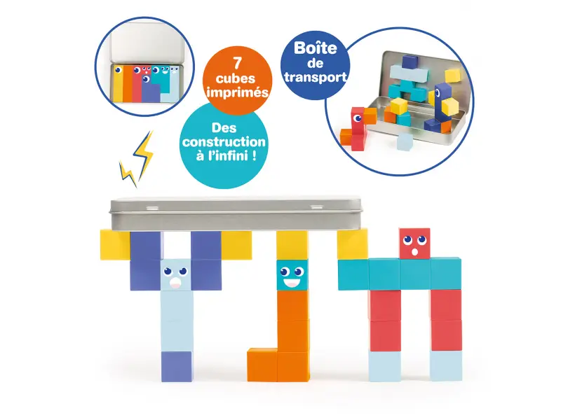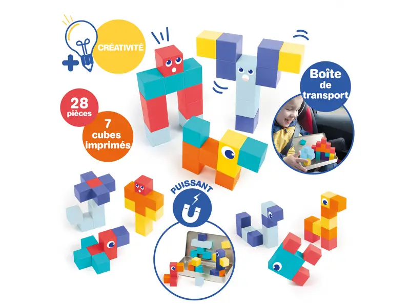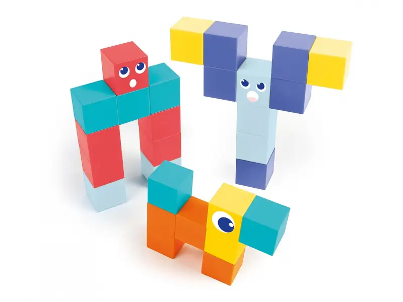 Magnetická stavebnice Ludi s kostkami je praktická cestovní sada, která zabaví děti doma i na cestách. Obsahuje 28 magnetických kostek, některé s motivy očí a obličejů, díky kterým děti snadno vytvářejí postavičky, zvířátka i malé stavby. Kostky se skládají intuitivně a magnety podporují zkoušení různých kombinací, rovnováhy a prostorového uspořádání. Součástí je kovová krabička, která slouží jako úložiště i magnetická hrací plocha, takže je stavebnice ideální do auta, do restaurace nebo na cesty. Hra rozvíjí jemnou motoriku, koordinaci oko ruka, logické uvažování i vyprávění příběhů.