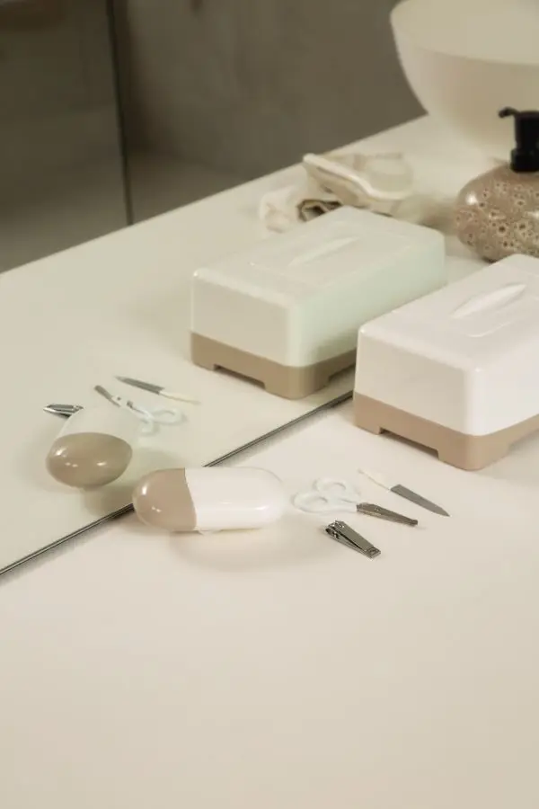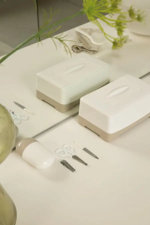 Manikúra obsahuje nožnice so zaguľatenými koncami, pilníček na nechty a tiež klieštiky na nechty. Všetko je vyrobené z nehrdzavejúcej ušľachtilej ocele. Krabička chráni pred prachom a pomáha udržiavať manikúru v čistote. Ale aj napriek tomu pred každým použitím jednotlivé nástroje starostlivo očistite a u novorodencov aj dezinfikujte roztokom liehu.