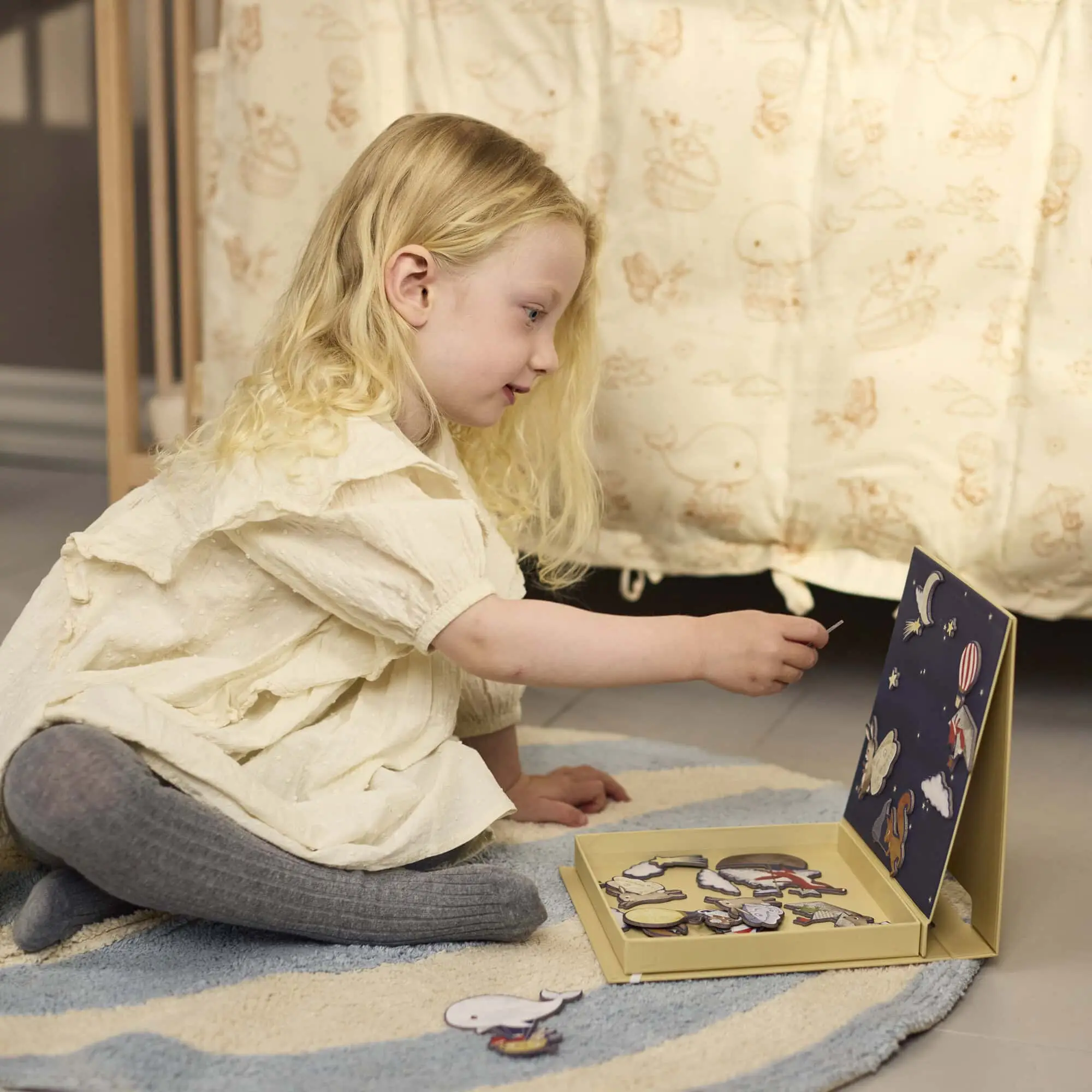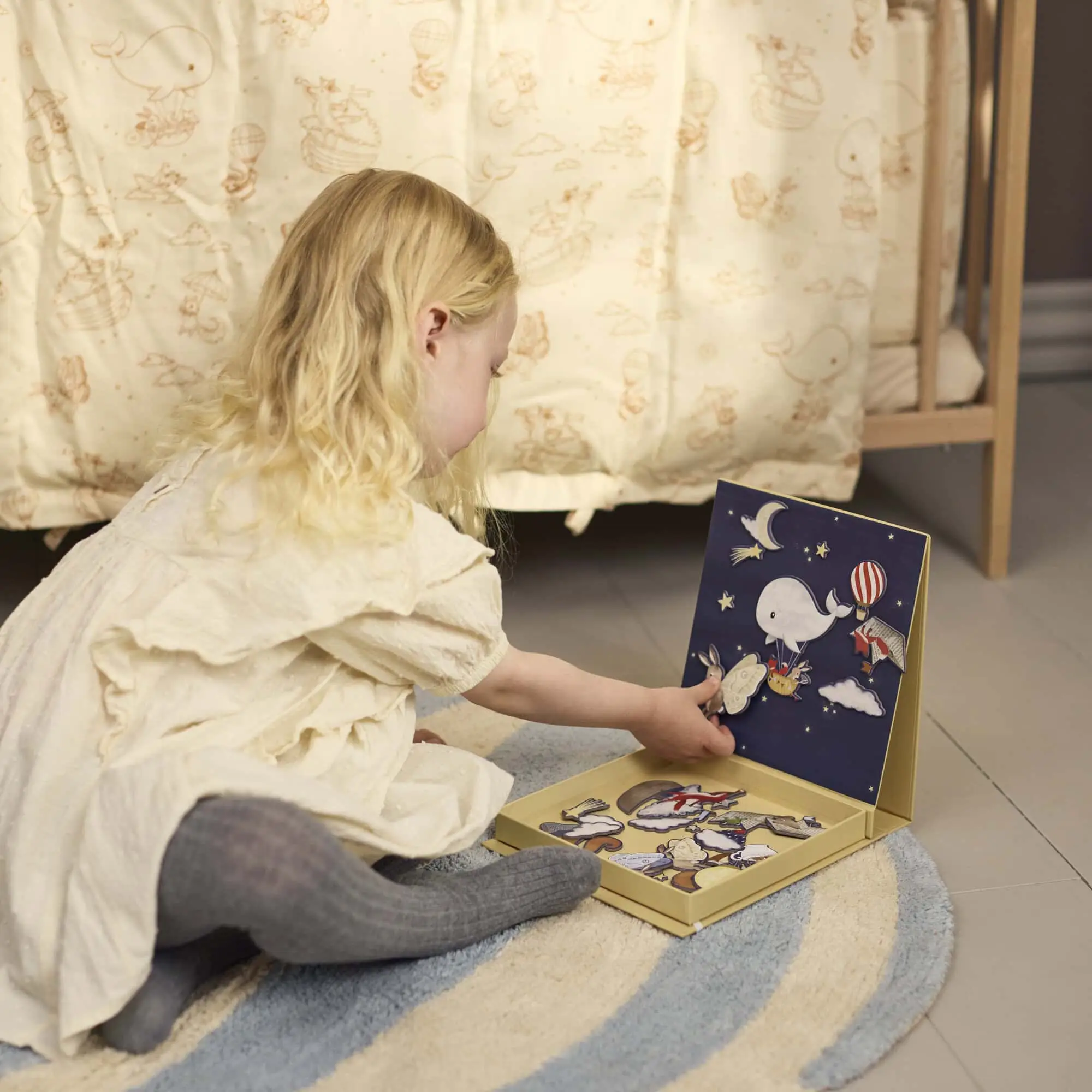 S očarujúcim pozadím hviezdnej oblohy táto kúzelná magnetická hra pozýva deti vytvárať vlastné rozprávkové scény. Vďaka pestrým, ručne kresleným postavičkám a hravým prvkom je dokonalou kombináciou rozvoja fantázie, rozprávania príbehov a jemnej motoriky. Zabalená je v praktickej krabičke so zabudovanou magnetickou tabuľkou, takže ju môžete jednoducho vziať so sebou na cesty a všetky dieliky zostanú bezpečne na mieste.