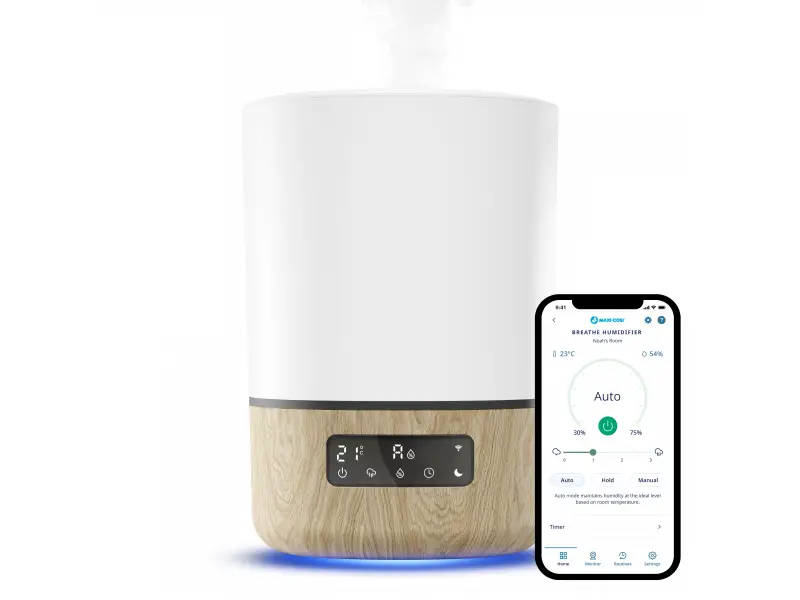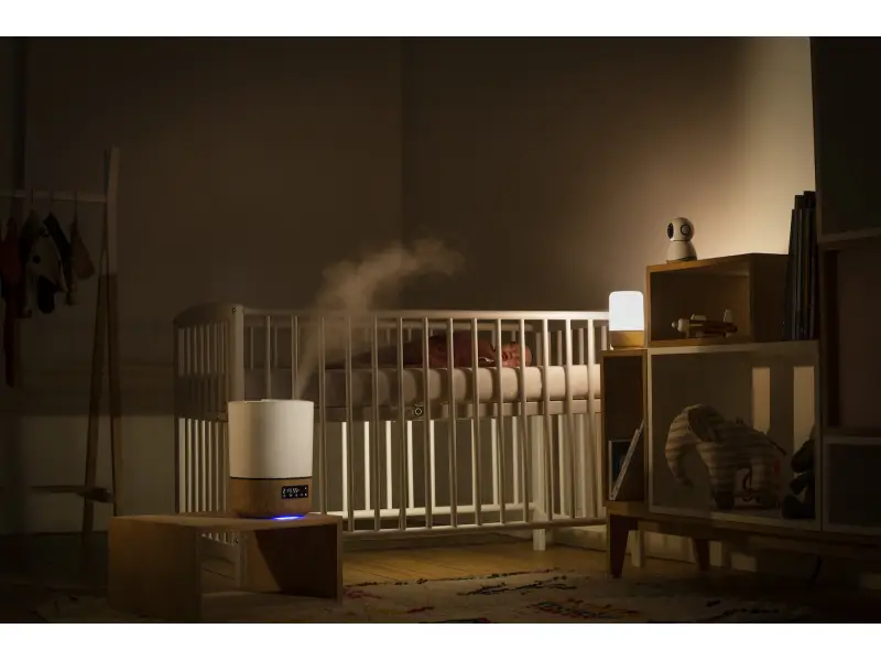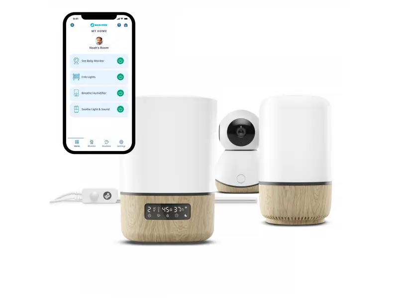 Zvlhčovač vzduchu Maxi-Cosi je šikovný zvlhčovač vzduchu do detskej izby, ktorý pomáha udržať ideálnu vlhkosť pre pokojný spánok dieťaťa. Vďaka sade senzorov zvládne pracovať plne automaticky, keď sám zvolí optimálnu vlhkosť podľa teploty v miestnosti. Ak chcete, môžete všetko nastaviť ručne: cieľovú vlhkosť, intenzitu hmly aj časovača. Všetko pohodlne nastavíte aj na diaľku cez aplikáciu Maxi-Cosi Connected Home. Prístroj funguje aj ako difuzér esenciálnych olejov pre vytvorenie príjemnej atmosféry pre odpočinok a zaspávanie.