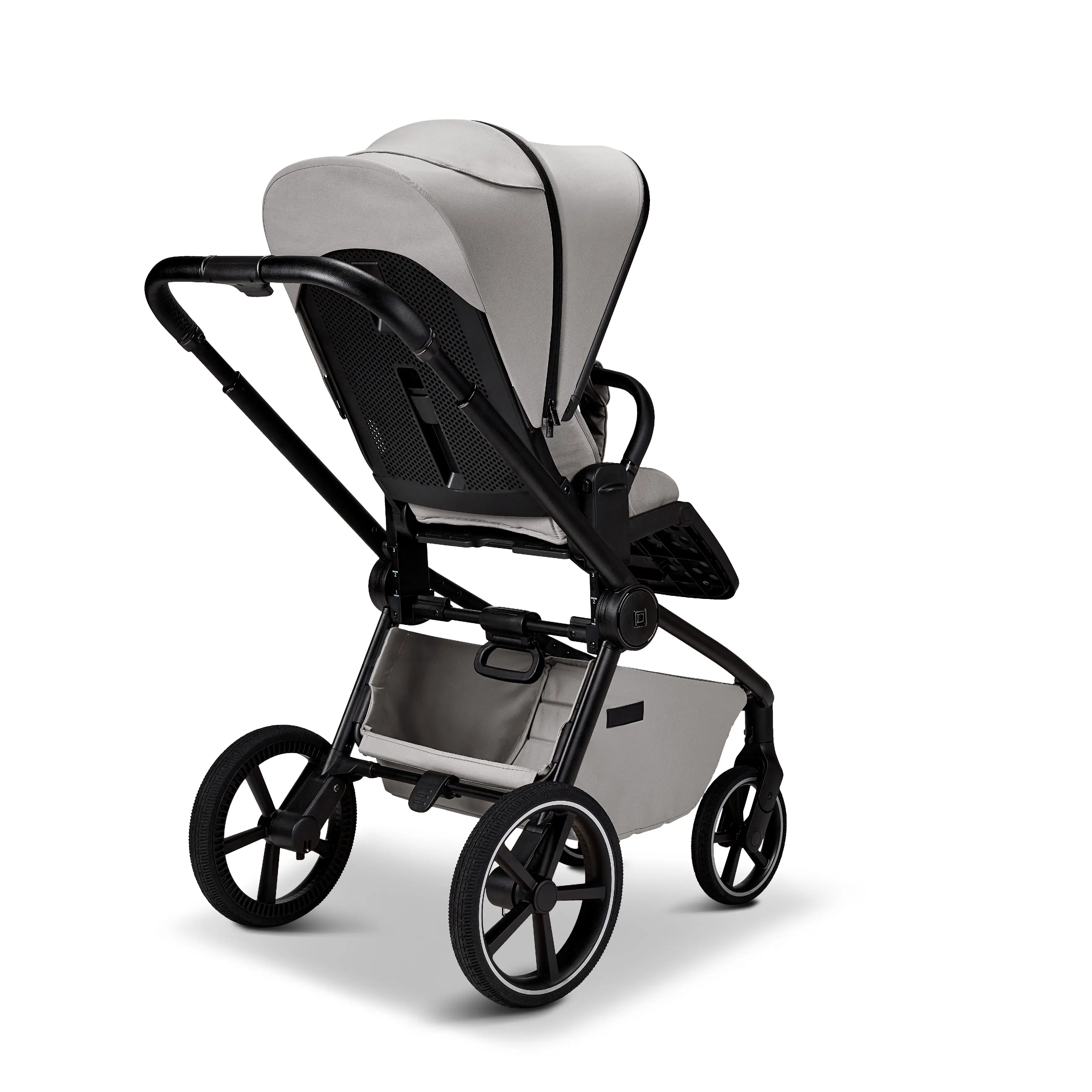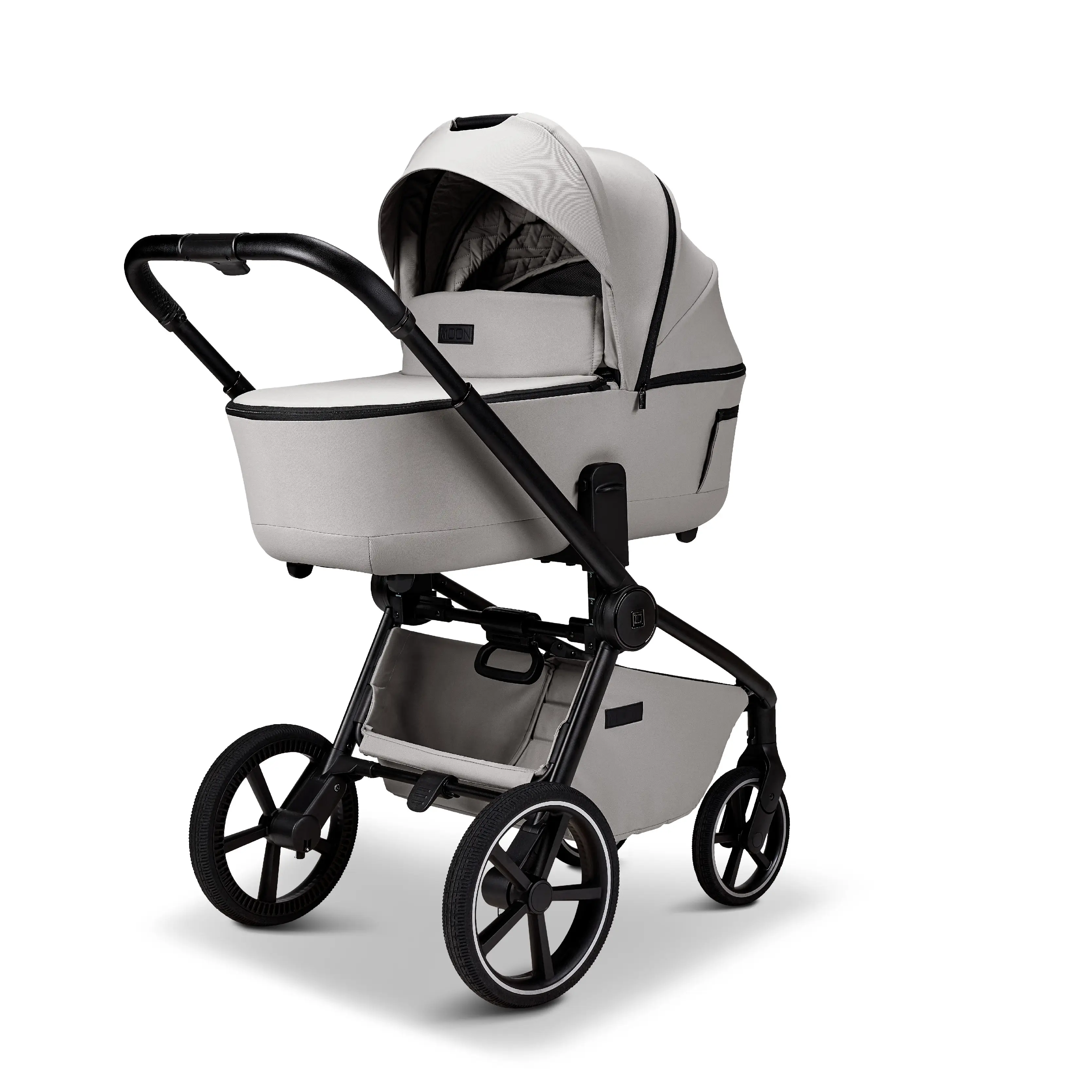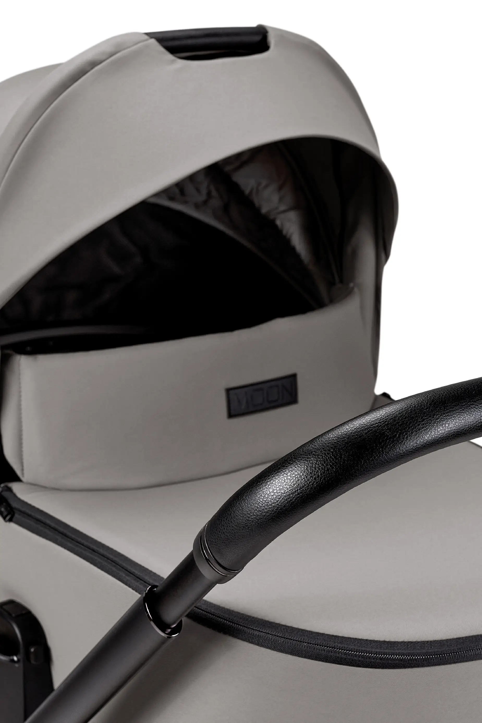 Moderný interiér kočíka vo svetlosivej farbe - elegantný a štýlový vzhľad. Látkový poťah na kolíske - dodáva šmrnc a mäkkosť.