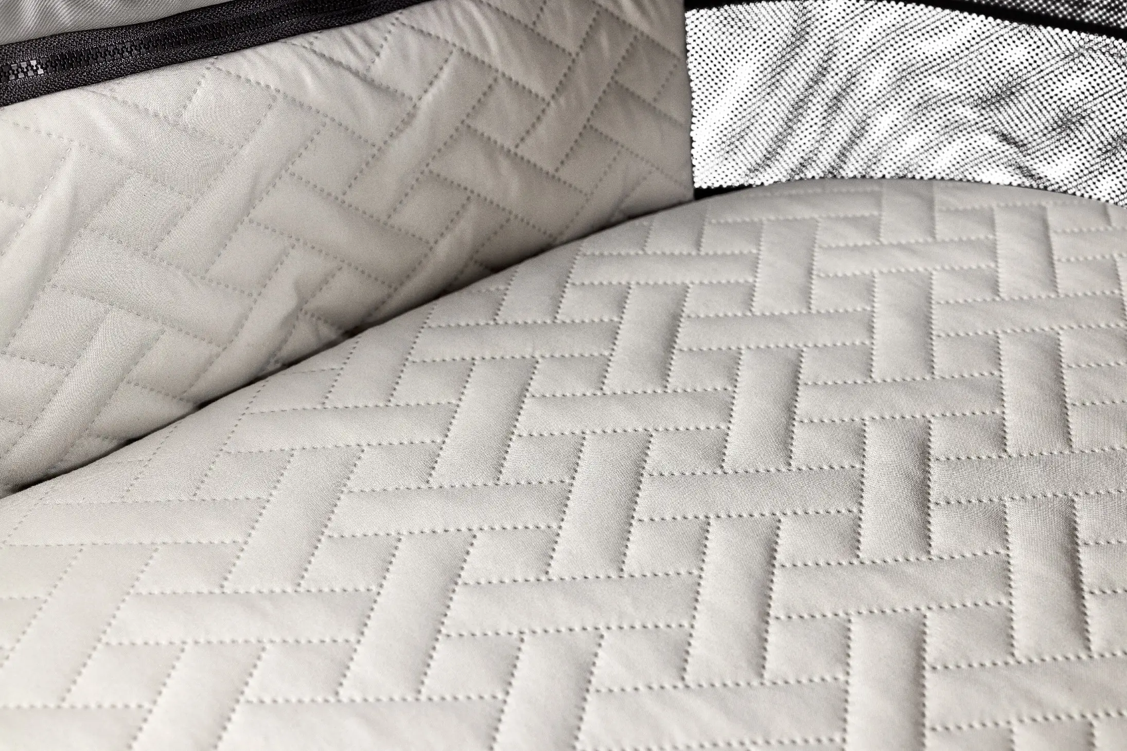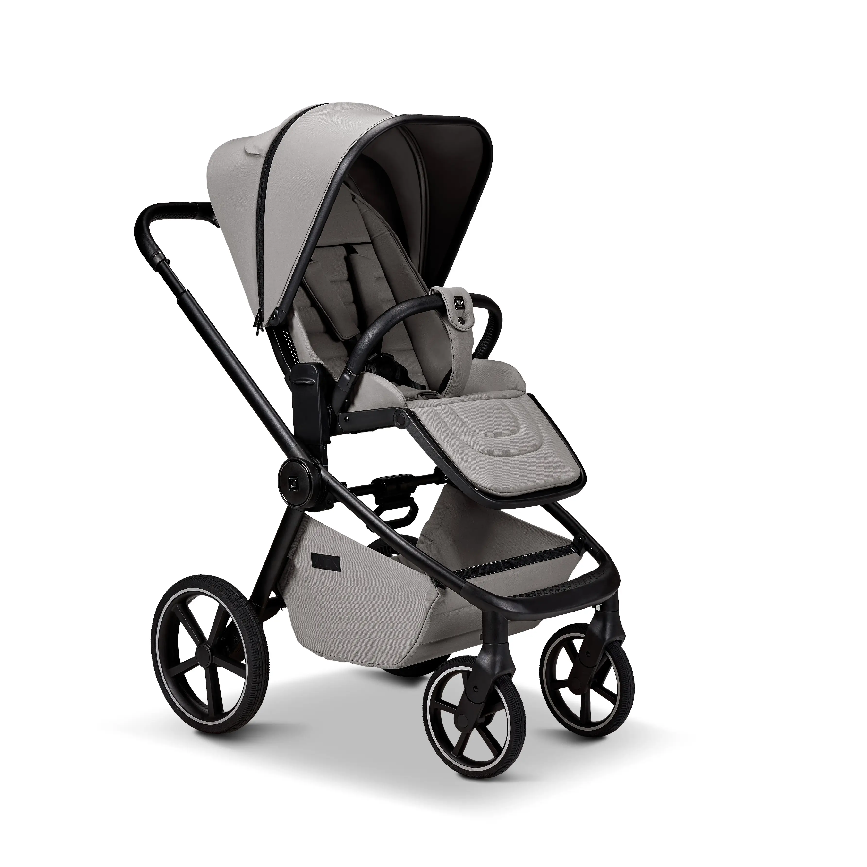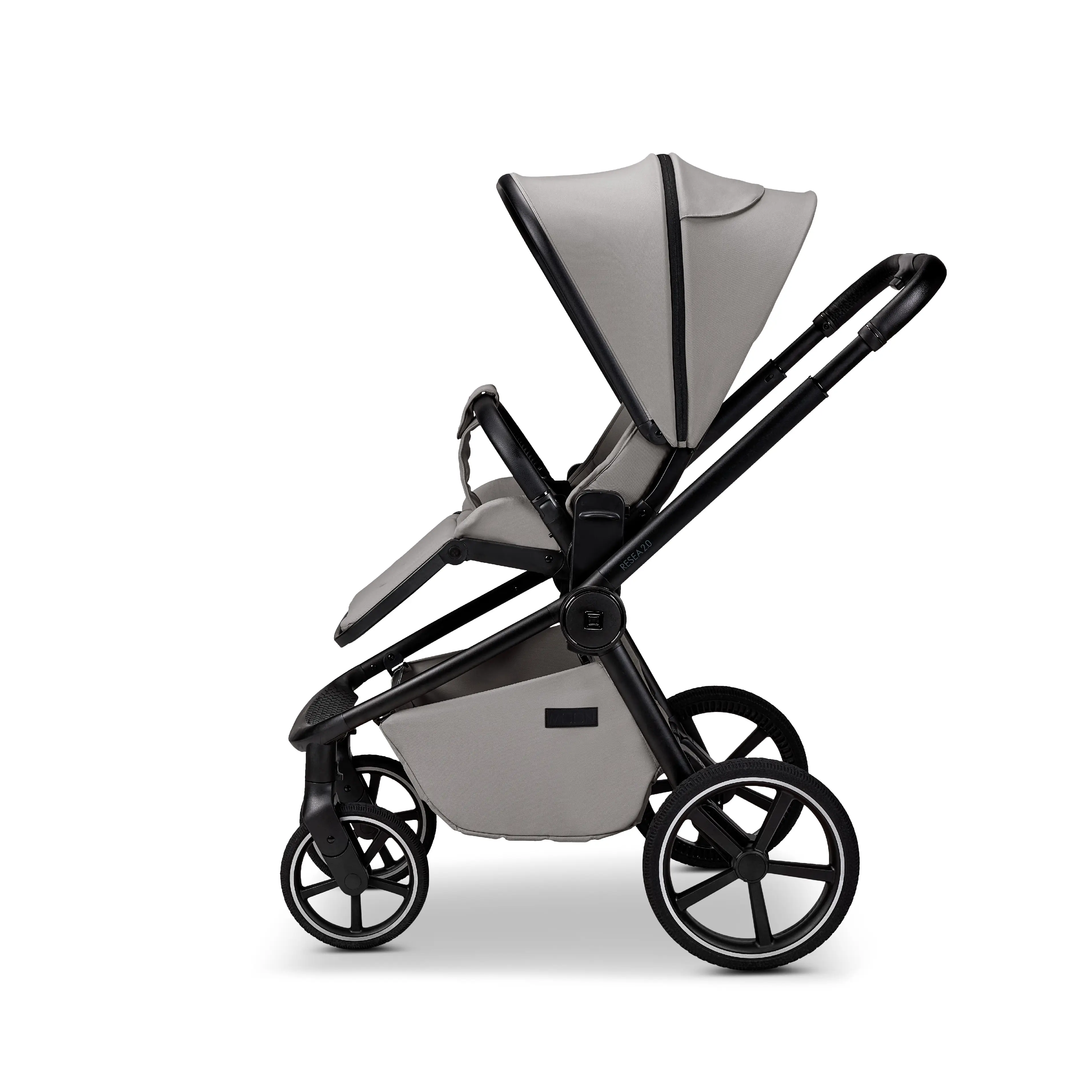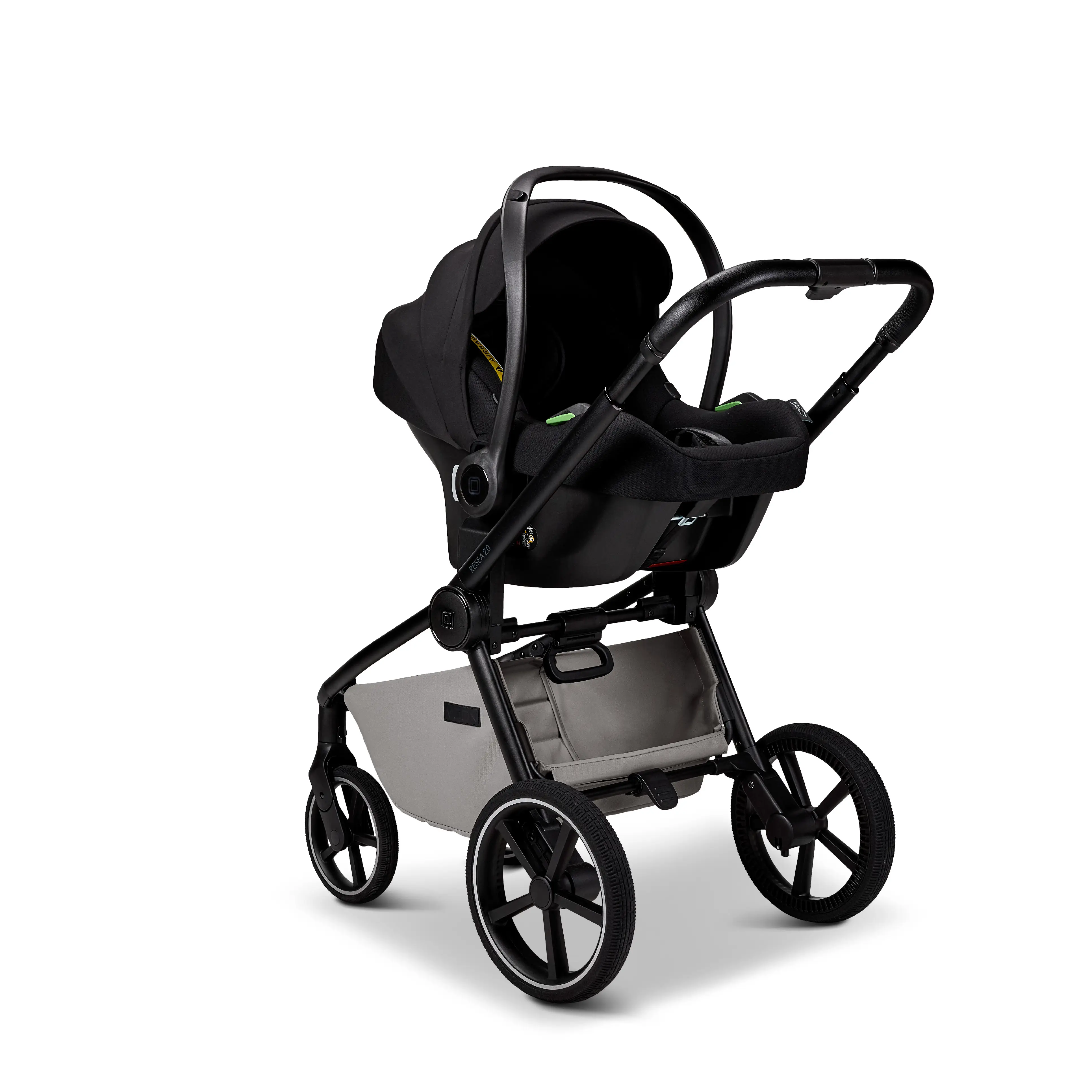 Moderný interiér kočíka vo svetlosivej farbe - elegantný a štýlový vzhľad. Látkový poťah na kolíske - dodáva šmrnc a mäkkosť.