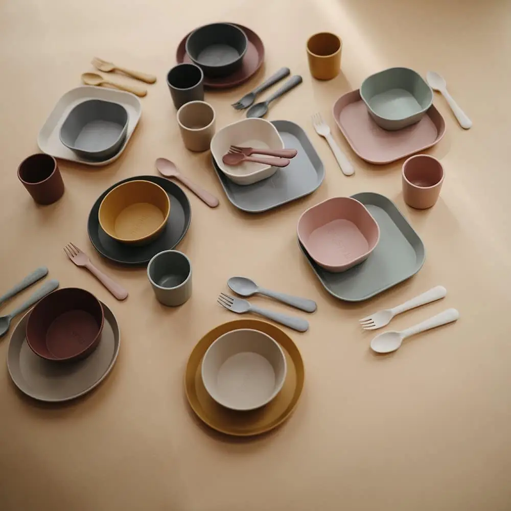 Štýlová a praktická sada príboru od Mushie, navrhnutá pre malé deti.
