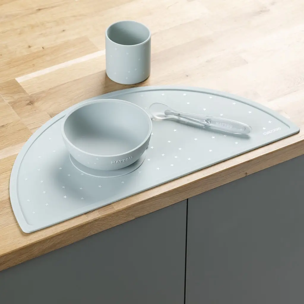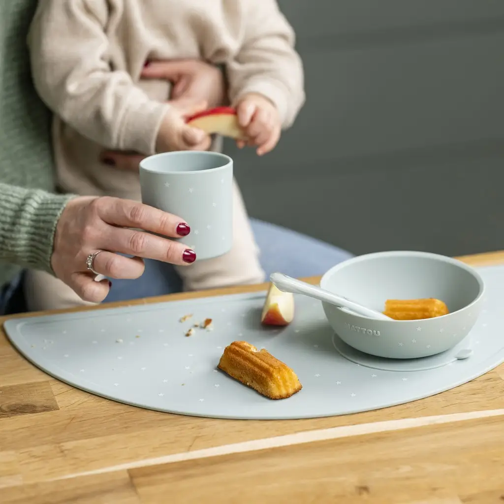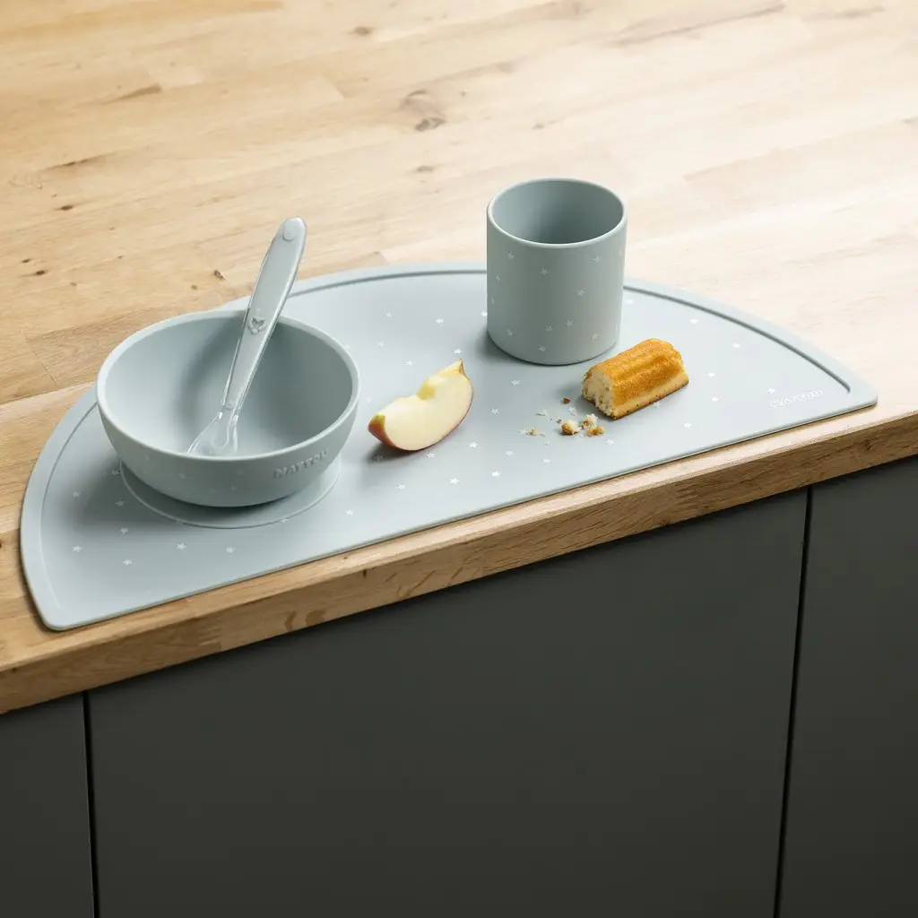 S touto elegantnou silikónovou jedálenskou súpravou môže vaše dieťatko jesť bez obáv. Zvýšený okraj taniera a prísavná podstava zabraňujú vylievaniu jedla na zem. Lyžička je dokonale prispôsobená malým rúčkam a ústam bábätiek a malých detí, takže sa stáva ideálnym pomocníkom pri kŕmení a učení sa samostatnosti.