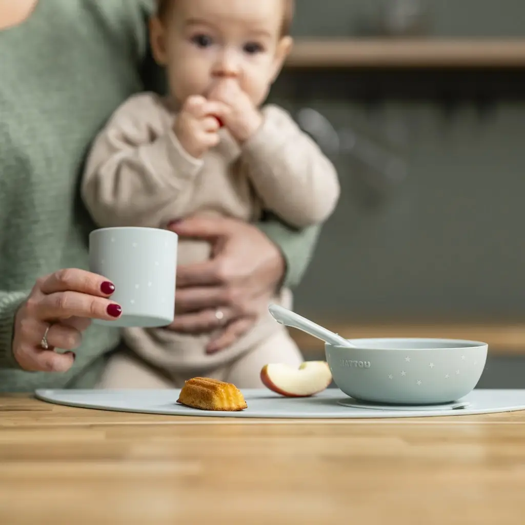 - Jedálenská súprava pre bábätká a malé deti: tanier, miska, pohár a lyžička z mäkkého silikónu.
