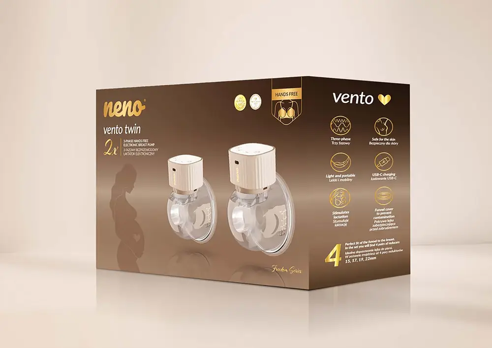 Inovatívna trojfázová bezdrôtová odsávačka mlieka pre obe prsia! Neno Vento Twin je pokročilá odsávačka mlieka navrhnutá pre mamičky, ktoré chcú spojiť slobodu pohybu s efektívnym a pohodlným odsávaním. Diskrétny tvar umožňuje nosenie priamo v podprsenke, čím poskytuje úplne hands-free riešenie pre odsávanie doma, v práci alebo na cestách. Tri režimy sania verne napodobňujú prirodzený rytmus dojčenia a podporujú tvorbu mlieka v každej fáze laktácie. Tiché, kompaktné a jednoducho ovládateľné riešenie vhodné aj pre citlivé prsia – praktický pomocník aj skvelý darček pre modernú mamičku.