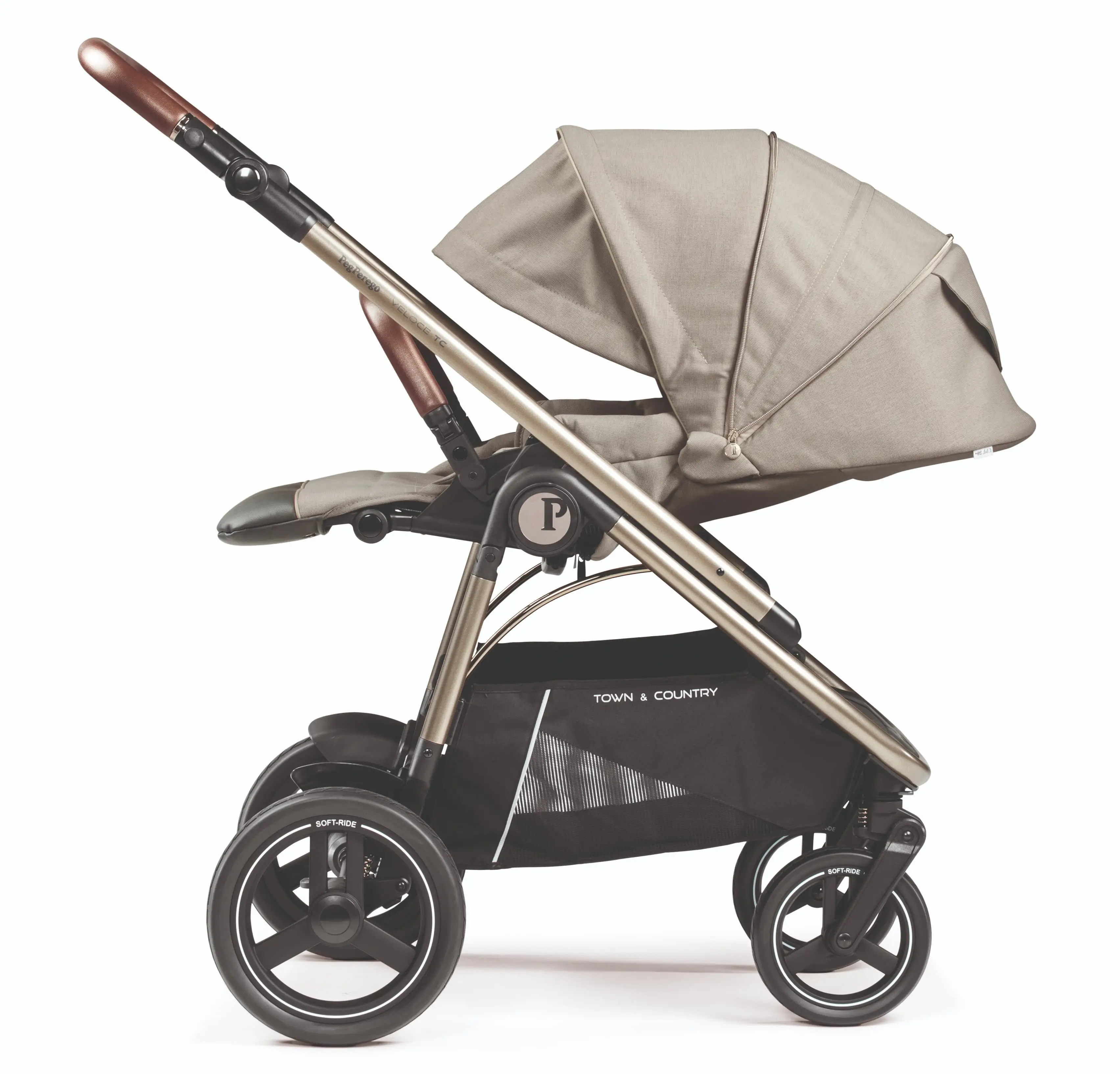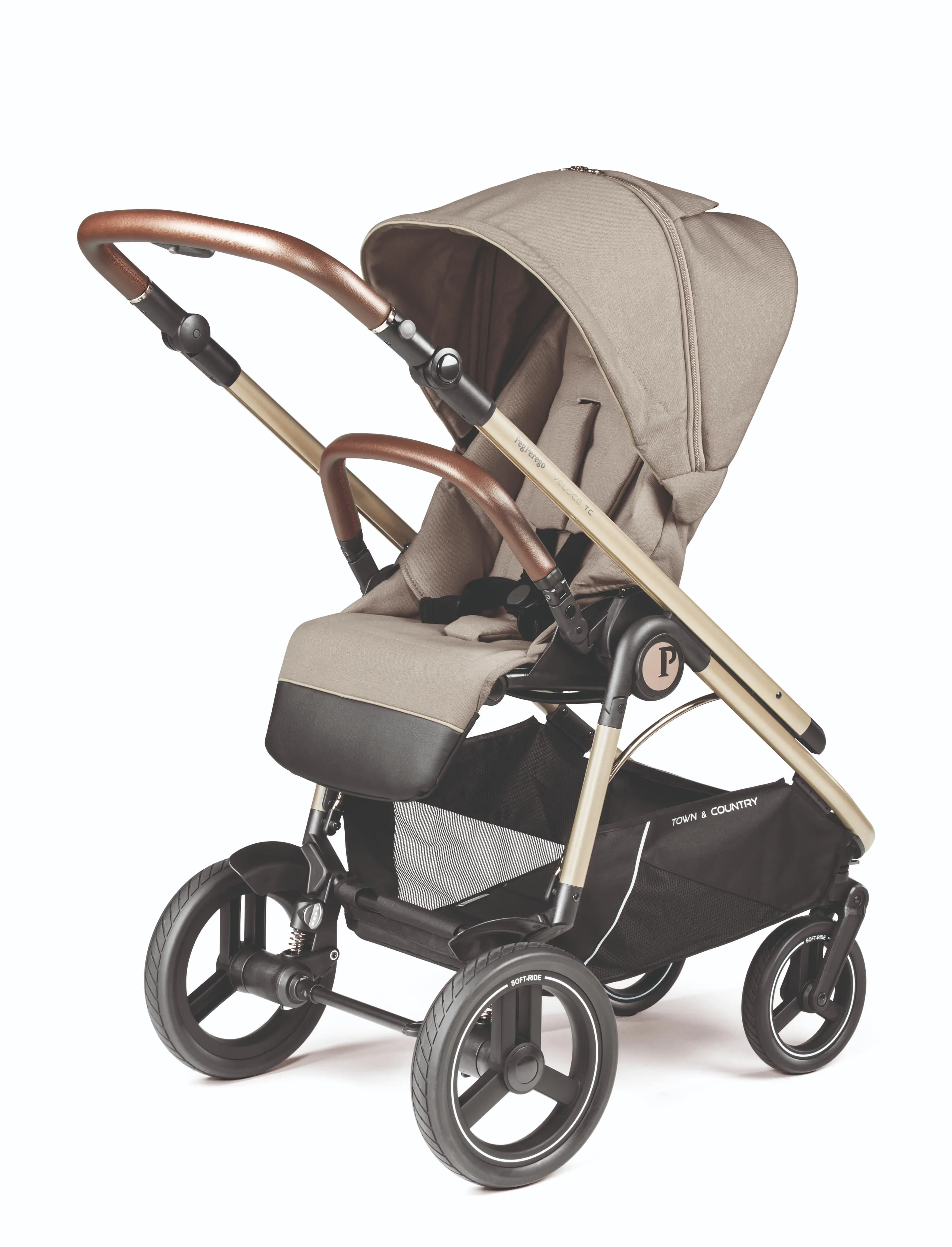 Exkluzívny model talianskej značky Peg Perego. Systém Town Country umožňuje zvoliť najvhodnejší režim jazdy kočíka v závislosti od terénu. Veľké gumené kolesá a guličkové ložiská zabezpečujú ľahkú a mimoriadne hladkú jazdu.