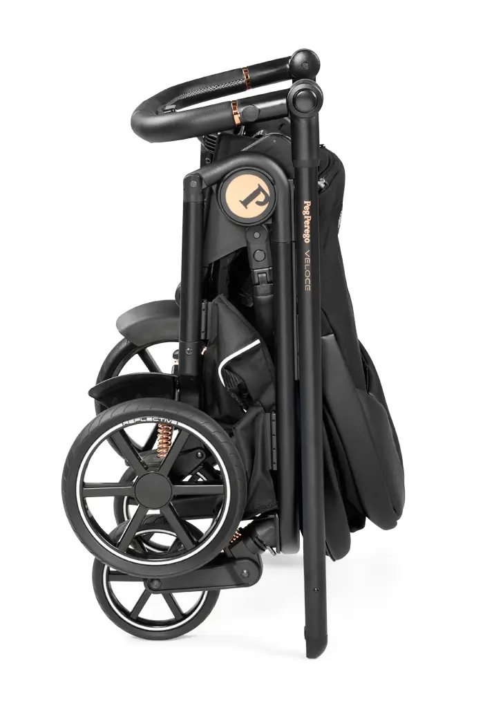 Vďaka dômyselnému systému sa kočík skladá iba jednou rukou bez nutnosti sa zbytočne zohýbať. V zloženom stave stojí kočík Veloce samostatne a pýši sa kompaktnými rozmermi, ktoré uľahčujú skladovanie kočíka doma či na návšteve. Vysoko kvalitné Soft-ride kolesá s reflexnými prvkami, zadným odpružením a guličkovými ložiskami zaisťujú jednoduché ovládanie kočíka na každom teréne. Predné otočné kolesá je možné kedykoľvek zaaretovať.