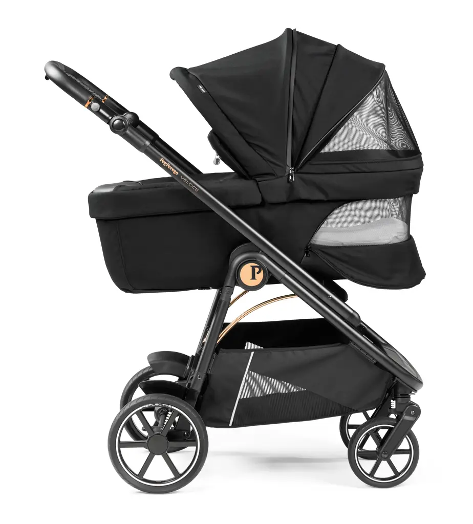 Výškovo nastaviteľná rukoväť v eco koži zaisťuje to najpohodlnejšie a najprívetivejšie ovládanie kočíka čo i len jednou rukou. Keďže aj na obyčajnú prechádzku je potrebné vziať si so sebou veľa nevyhnutností, ľahko prístupný a priestranný košík kočíka Veloce je vybavený vystuženým dnom pre ťažší náklad. Aj na košíku sa nachádzajú reflexné prvky pre vyššiu bezpečnosť počas zníženej viditeľnosti. Či už vaše dieťa v kočíku práve odpočíva alebo objavuje okolitý svet, rozťahovacia UPF 50+ strieška ho ochráni pred slnkom a vetrom. Nemenej užitočný je aj na mieru šitý nánožník, ktorý poskytuje ochranu dieťaťa aj v prípade sklopenej opierky chrbta.