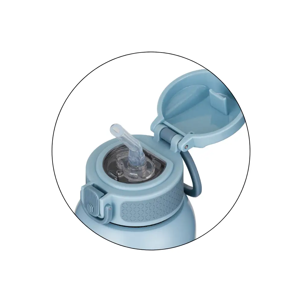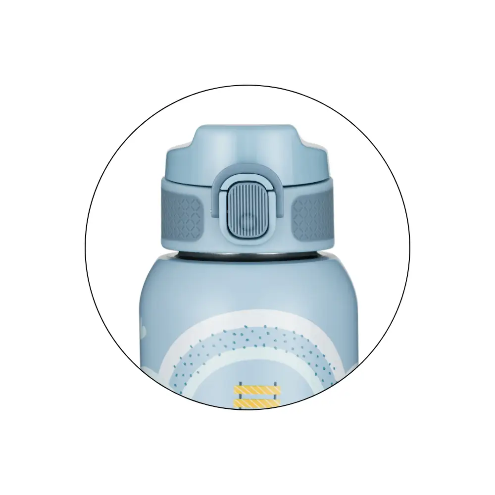 Sklopné viečko so silikónovou slamkou umožňuje jednoduché a pohodlné pitie bez rozlievania. Bezpečnostná poistka chráni pred nechceným otvorením v batohu a praktický držiak uľahčuje prenášanie aj pre malé detské ruky.