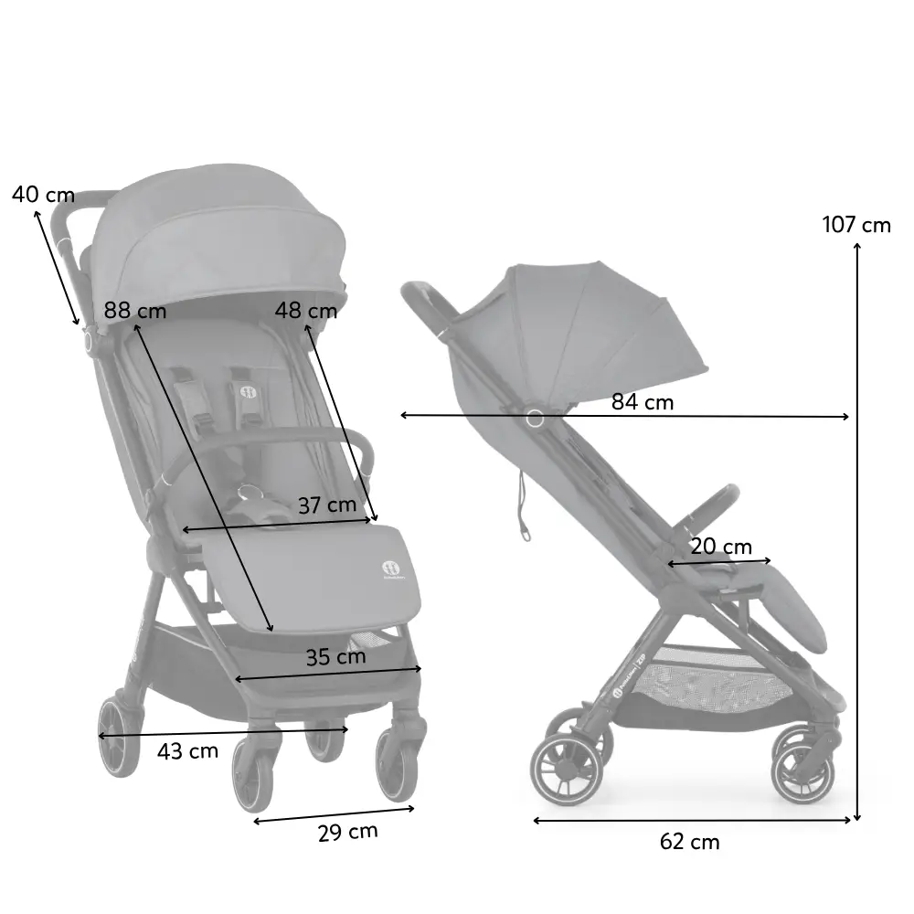 - Rozmery rozloženého kočíka: 84 cm (dĺžka od predného kolieska k rukoväti) × 35 cm (šírka) × 107 cm (výška)