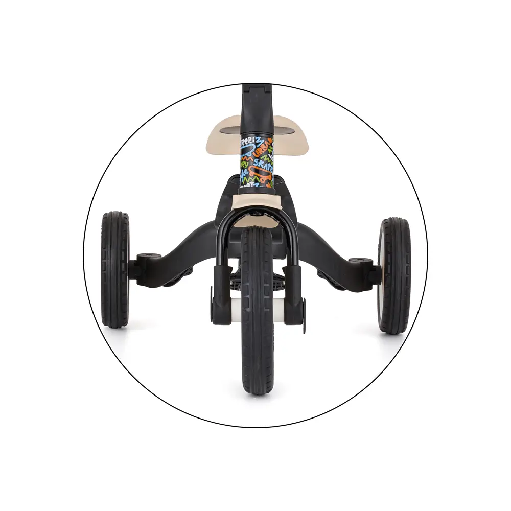 Multifunkčná trojkolka určená pre deti od 1,5 do 5 rokov alebo do 25 kilogramov je nielen dopravný prostriedok na presun a učenie sa rovnováhy, ale aj spoločník pre rastúce dieťa počas mnohých vývojových fáz. Vďaka premyslenej transformácii sa prispôsobí aktuálnym motorickým schopnostiam dieťatka – od trojkolky s asistenciou rodiča až po plnohodnotný bicykel s pedálmi.
