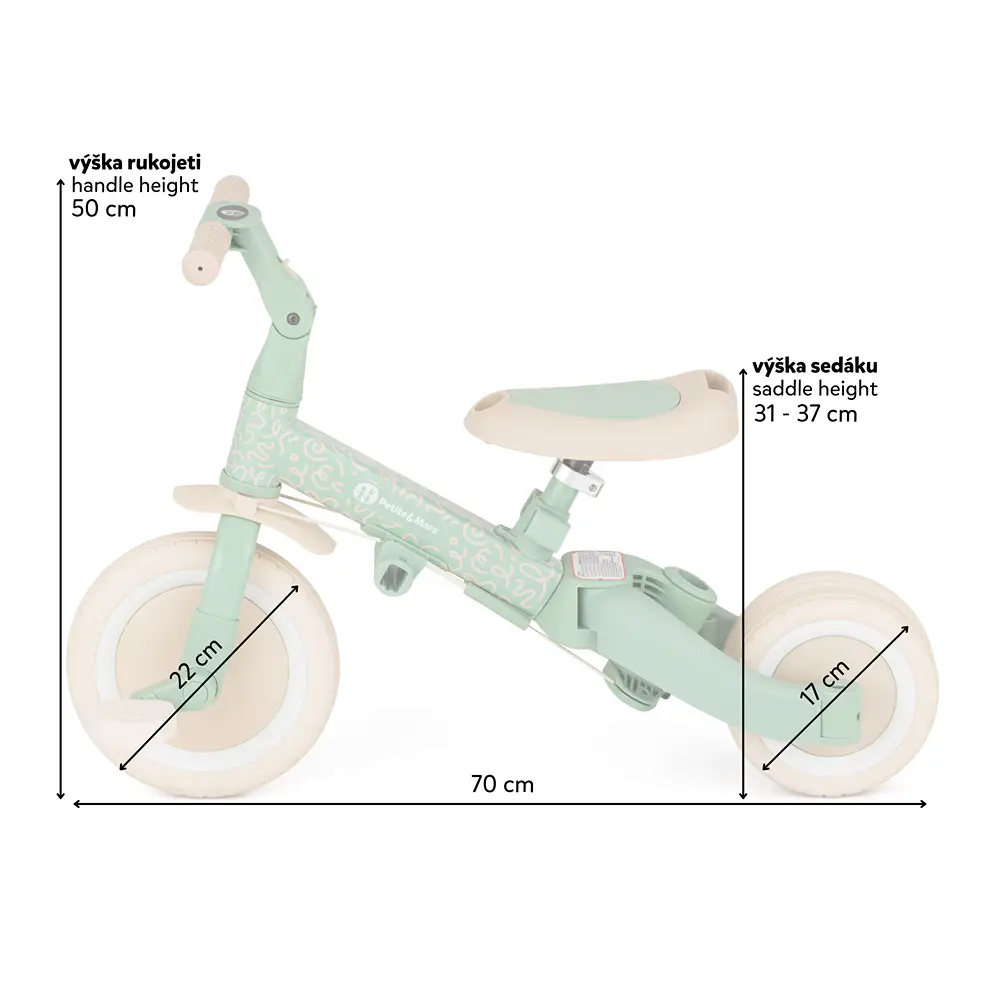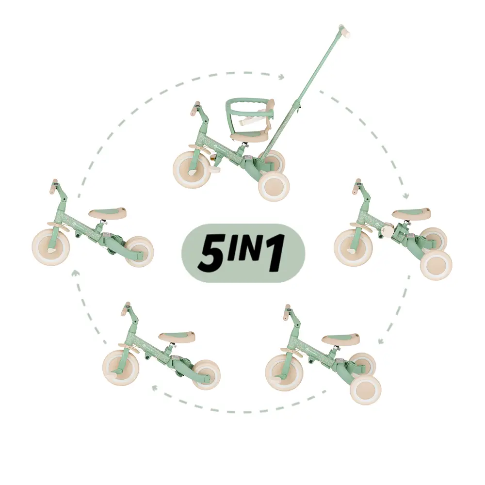 Multifunkčná trojkolka určená pre deti od 1,5 do 5 rokov alebo do 25 kilogramov je nielen dopravný prostriedok na presun a učenie sa rovnováhy, ale aj spoločník pre rastúce dieťa počas mnohých vývojových fáz. Vďaka premyslenej transformácii sa prispôsobí aktuálnym motorickým schopnostiam dieťatka – od trojkolky s asistenciou rodiča až po plnohodnotný bicykel s pedálmi.